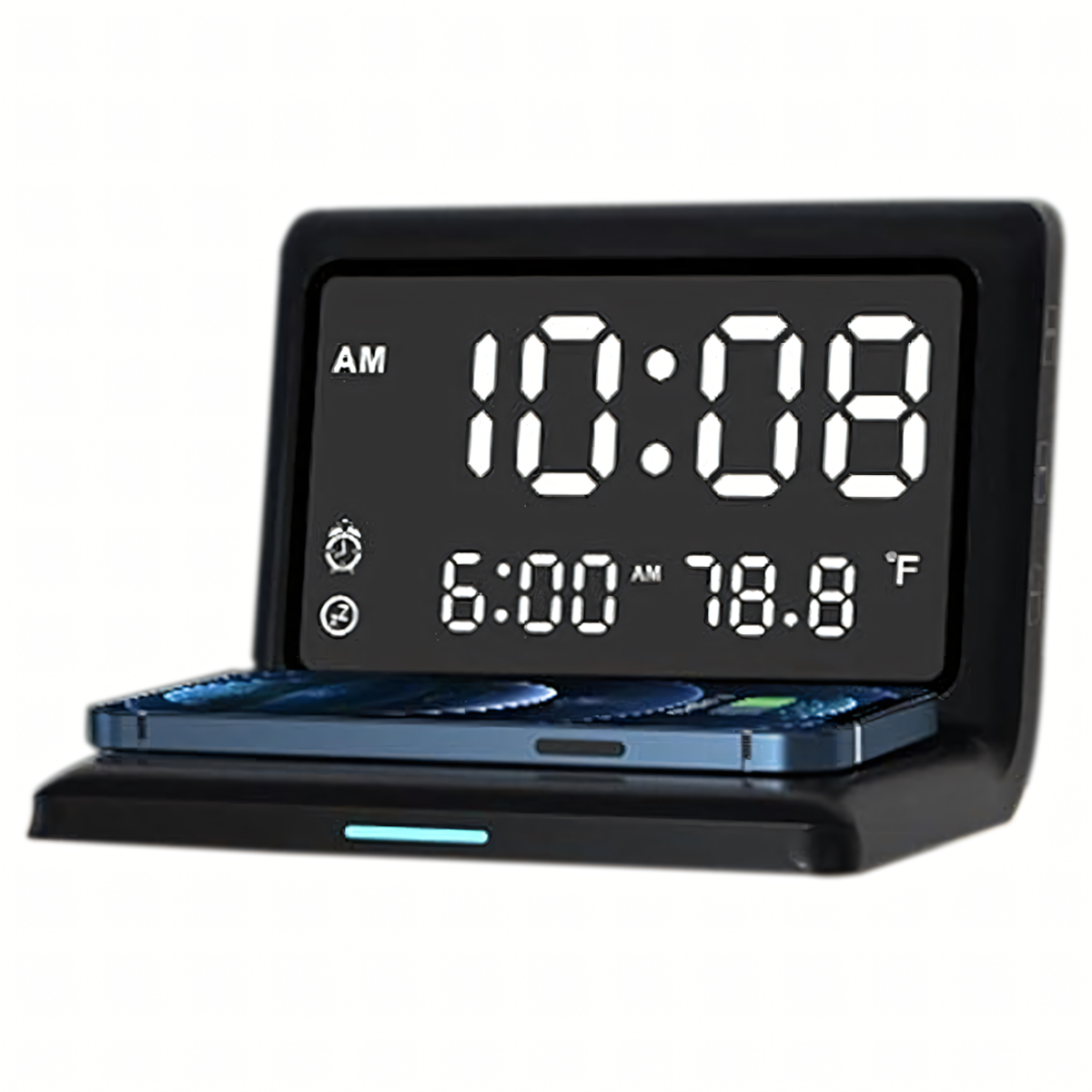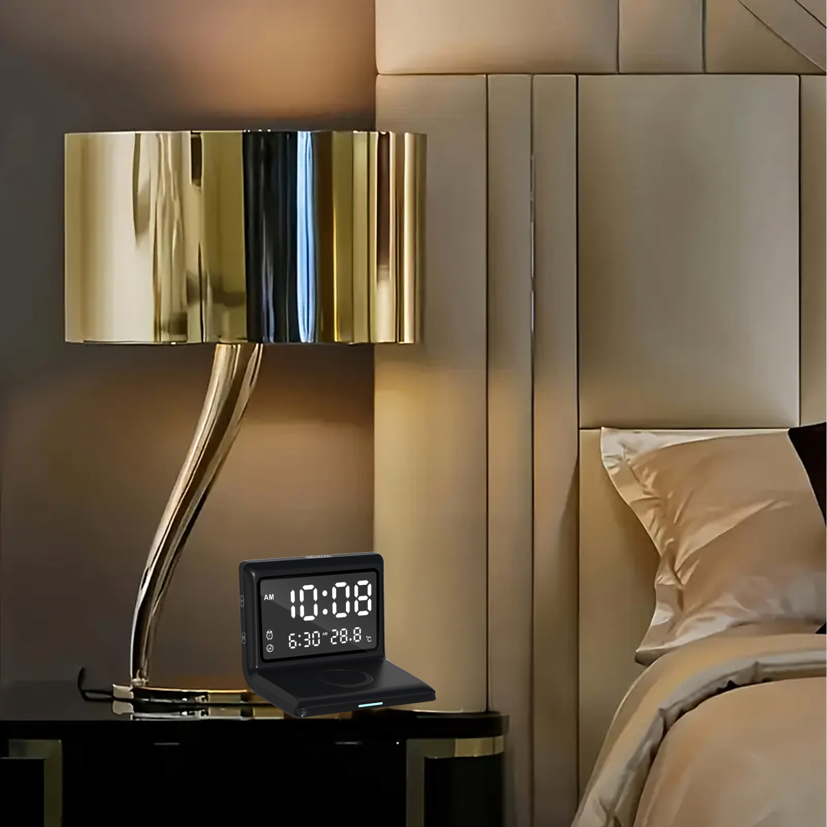 Kaasaegne 3w1 digitaalne kell koos juhtmevaba 15W laadijaga ja termomeetriga, mis ühendab äratuskella, elegantse peegli ja kiire telefoni laadimise funktsioonid – ideaalne kodus, kontoris või hotellis kasutamiseks.
