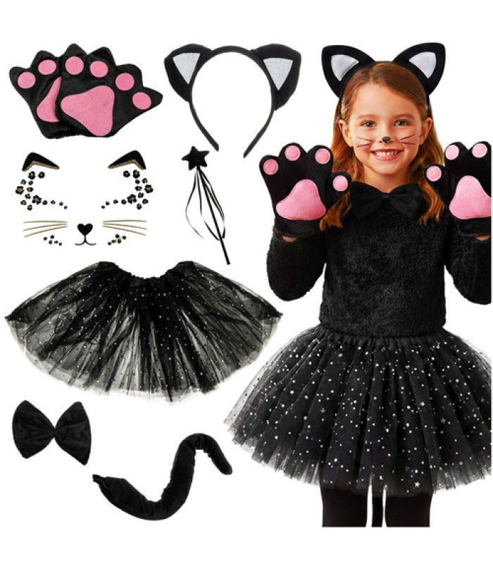 KRUZZEL juodos katės kostiumas mergaitėms, 7 viename rinkinys!