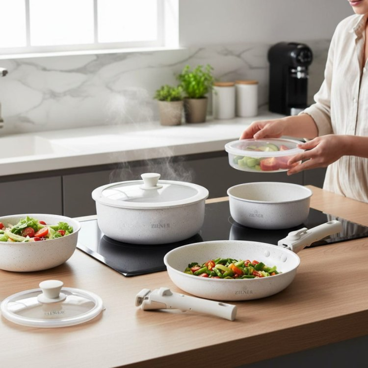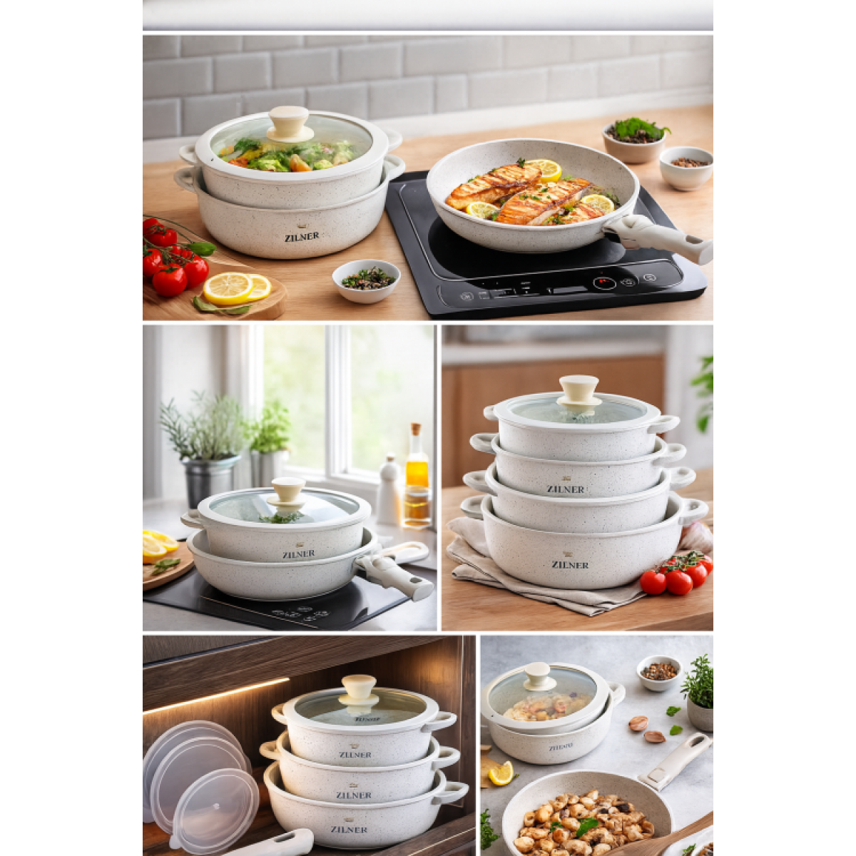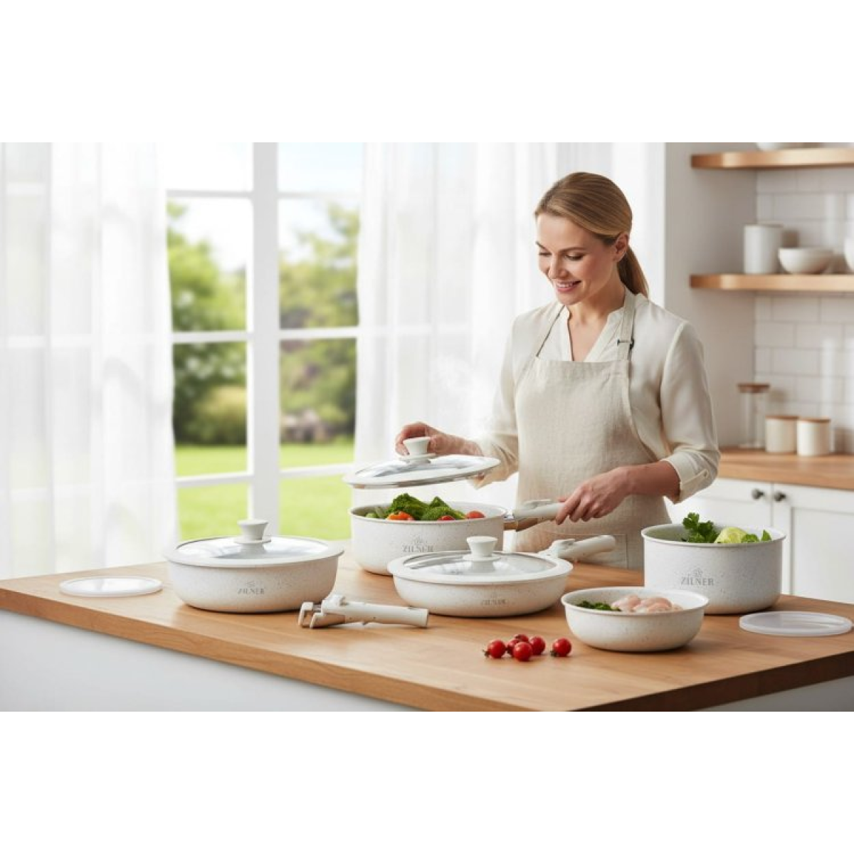 ZILNER ZL-8571 on moodne ja praktiline pottide ja pannide komplekt marmorist kivimassi mittenakkuva kattega ja eemaldatava universaalse käepidemega. See komplekt on loodud neile, kes hindavad köögis mugavust, kvaliteeti ja ruumisäästu.