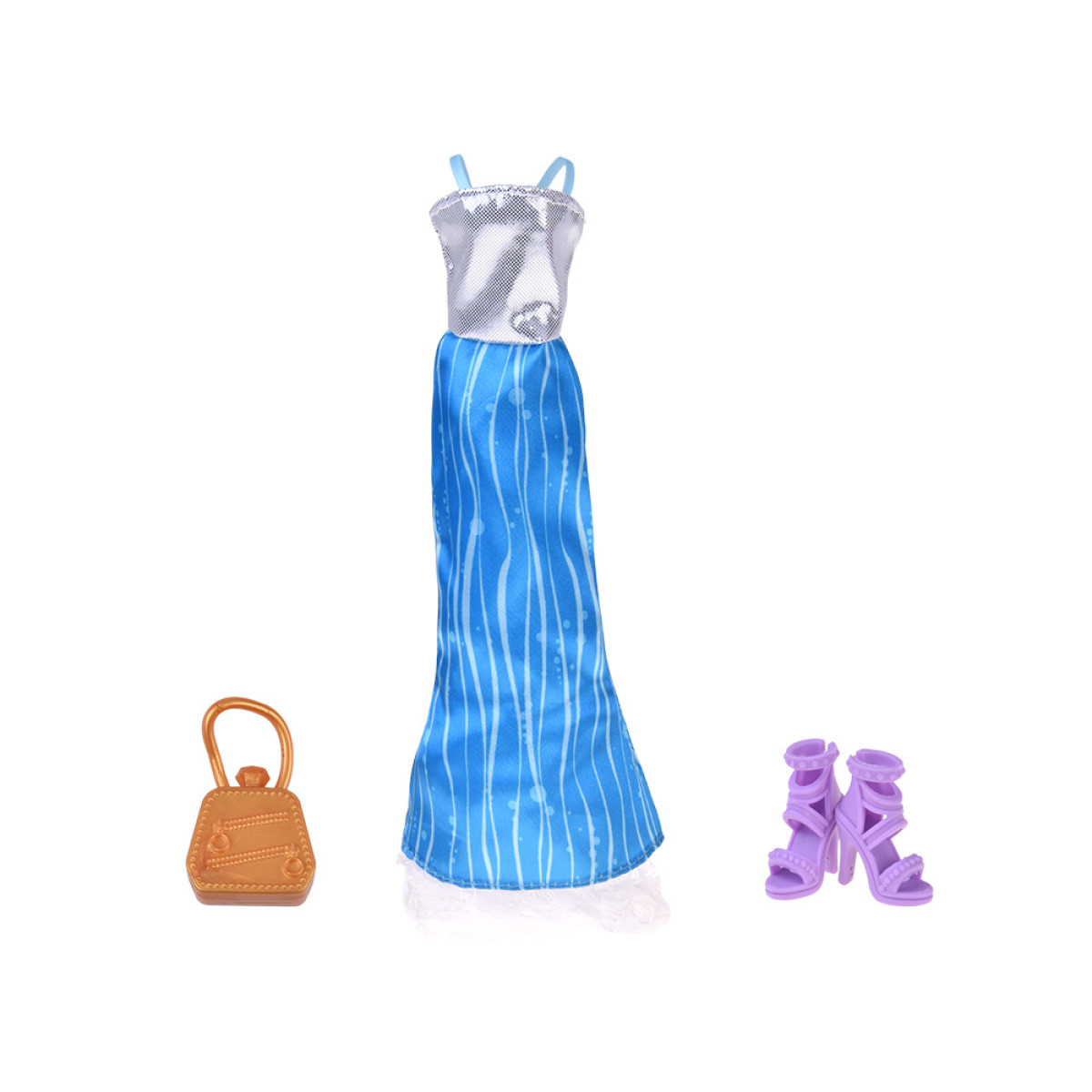 Õhtukleit on inspireeritud veepinnast – hõbedane, sillerdav ülaosa meenutab päikesekiiri vees, ja seelik meenutab laineid. Selge on, et tegu on tõelise mereprintsessiga! Stiili täiendavad moodsad aksessuaarid.