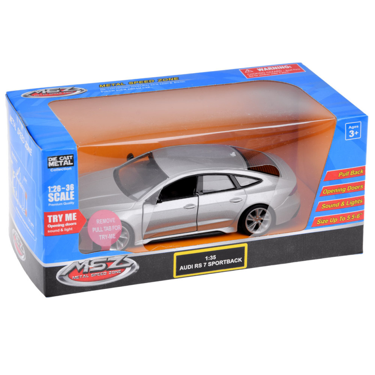 Audi RS 7 Sportback metallist mudel skaalas 1:35 on suurepärane täiendus autode mudelikollektsioonile. Sportauto on valmistatud väga hoolikalt ja esteetiliselt, pöörates tähelepanu väikseimatele detailidele, mis kindlasti rõõmustab iga väikest autojuhti. Autol on avatavad uksed ning heliefektid ja valgusefektid. Audi on varustatud hõõrdejõuülekandega, mis tähendab, et tagasi tõmmates sõidab auto sujuvalt ja kiiresti edasi. Auto töötab ka lükkamisega.