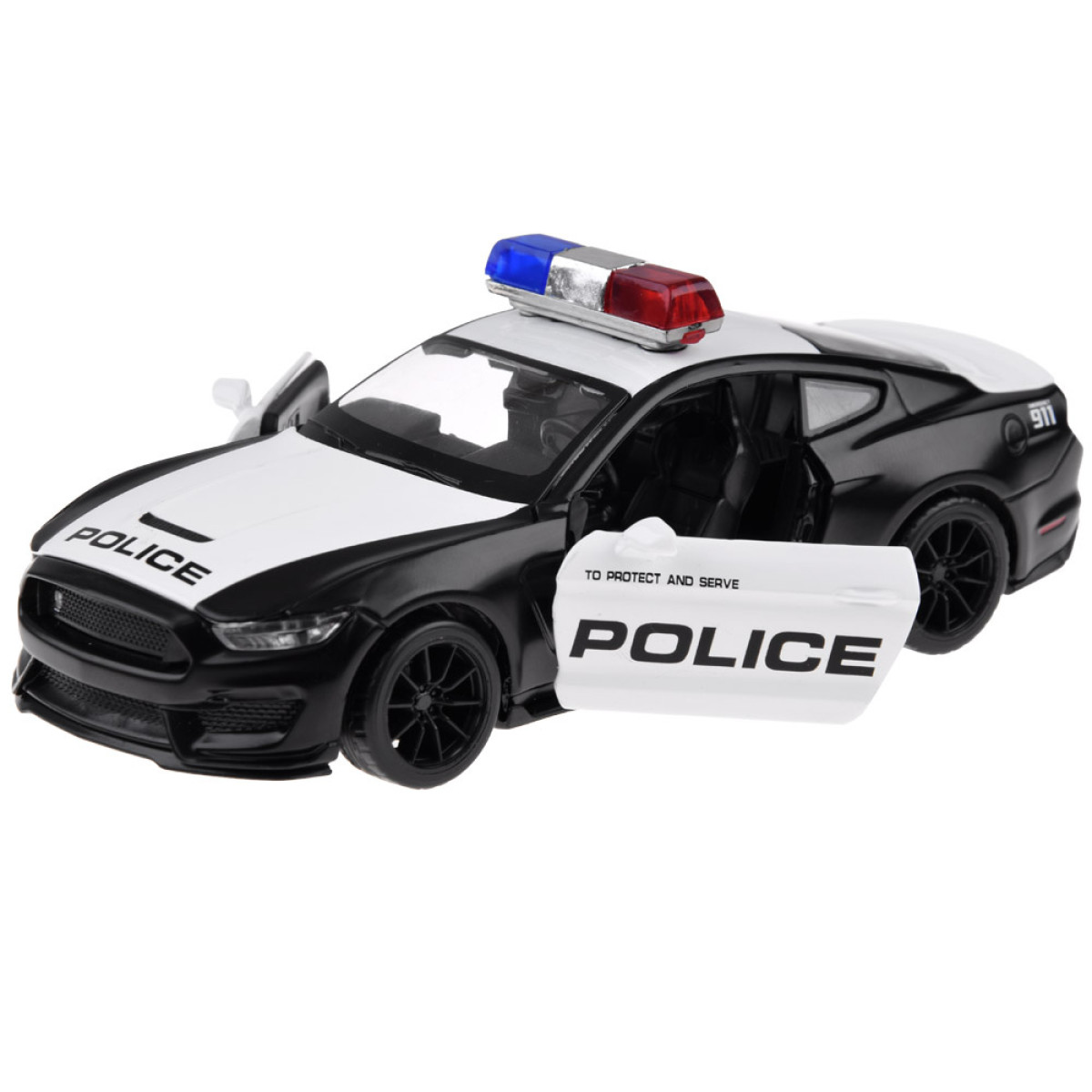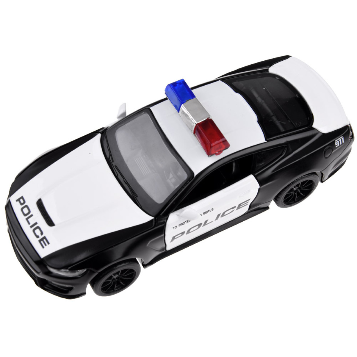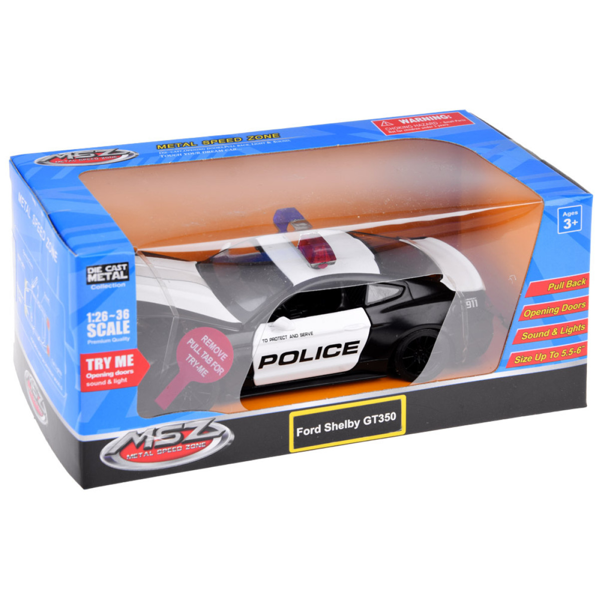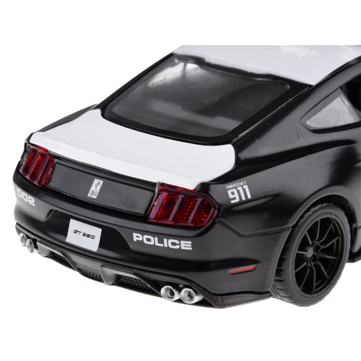 Politsei auto Ford Mustang Shelby GT350 skaala 1:32 on suurepärane lisand autode mudelikollektsiooni. Politsei sõiduk on väga hoolikalt ja esteetiliselt valmistatud, pöörates tähelepanu kõige väiksematele detailidele, mis kindlasti vaimustavad iga väikest juhti. Autol on avatavad uksed ning heliefektid ja valgusefektid. Ford Shelby'l on hõõrdejõul põhinev mootor, mis tähendab, et pärast selle tagasi tõmbamist siledal, tasasel pinnal liigub see edasi. Auto töötab ka tõukamisega.