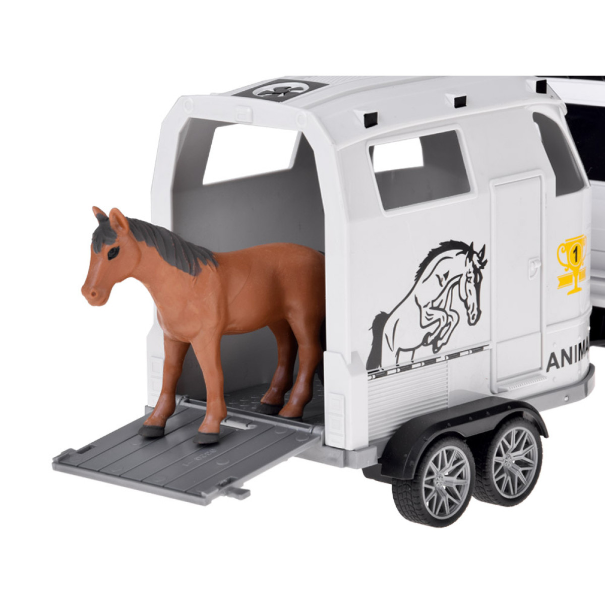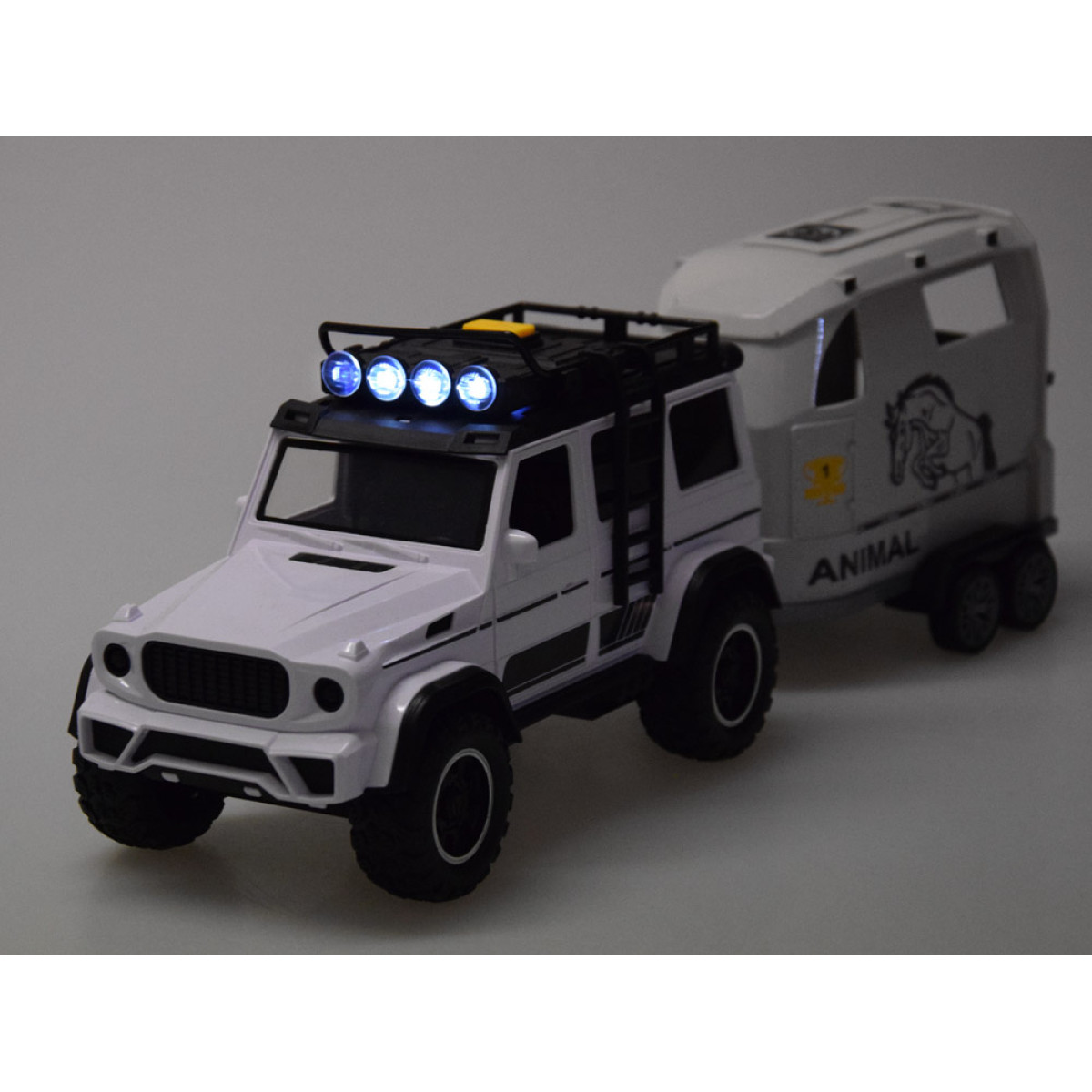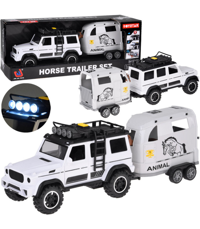 Maastikuauto avatud haagisega, mis on ideaalne lastele, kes armastavad sõidukeid ja mänguasjade transportimist. Komplektis on interaktiivne valge maastikuauto mustade detailidega ja hele haagis, mis on mõeldud ohutuks hobuste veoks, kuid lapsed võivad sinna panna, mida iganes nad soovivad transportida.