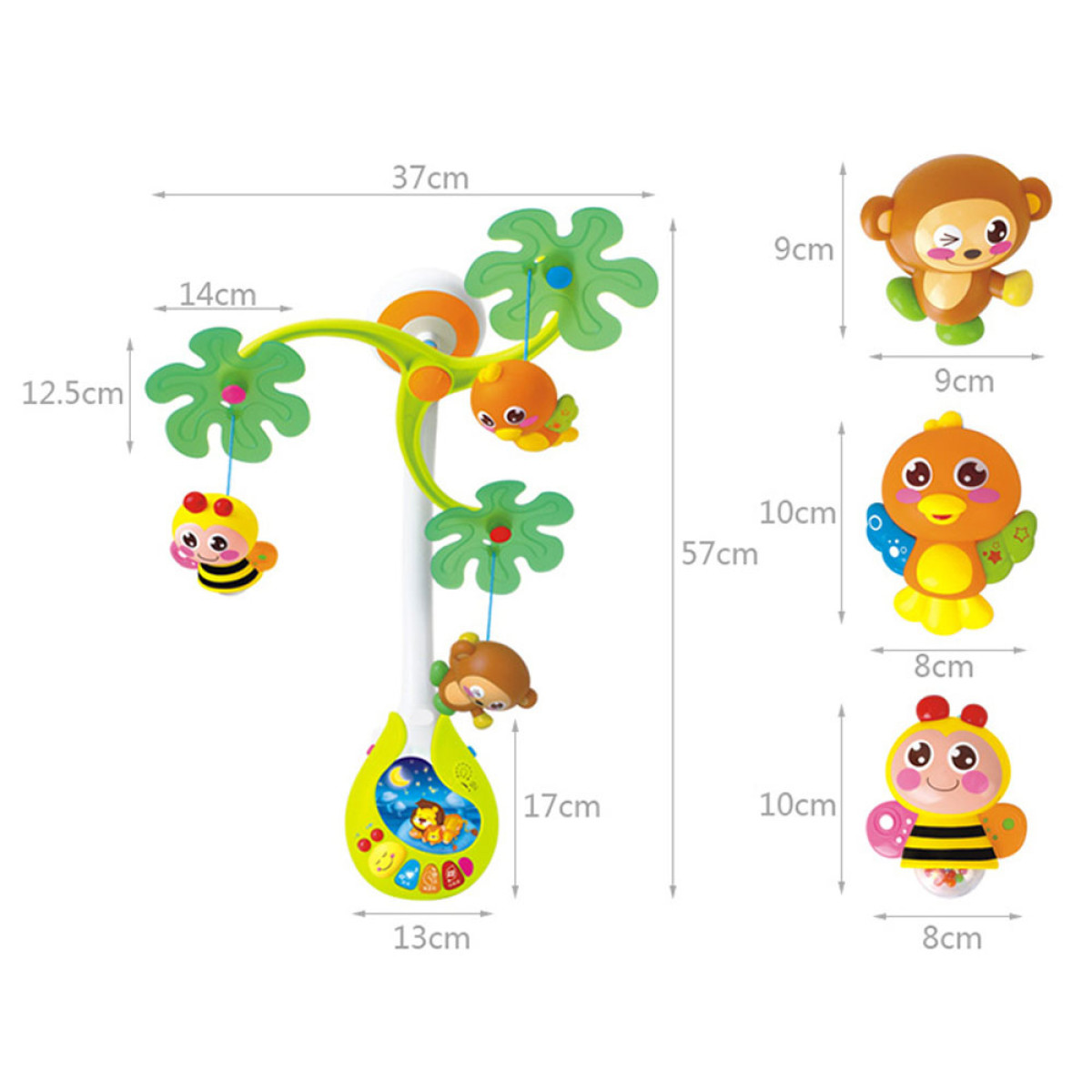 Muusikakasti meloodiad on väga rahulikud ja leebed. Karusselli konstruktsioon on plastikust ja loomakesed on erinevat värvi.