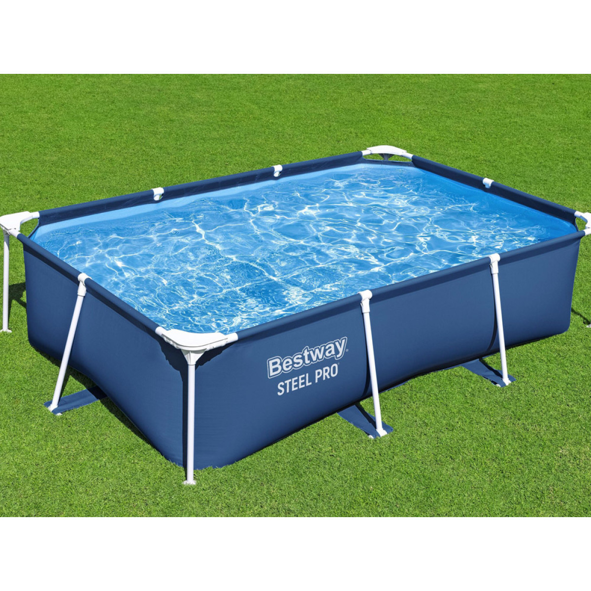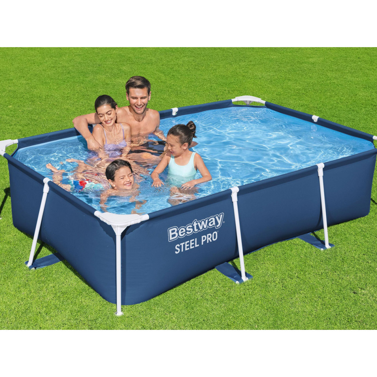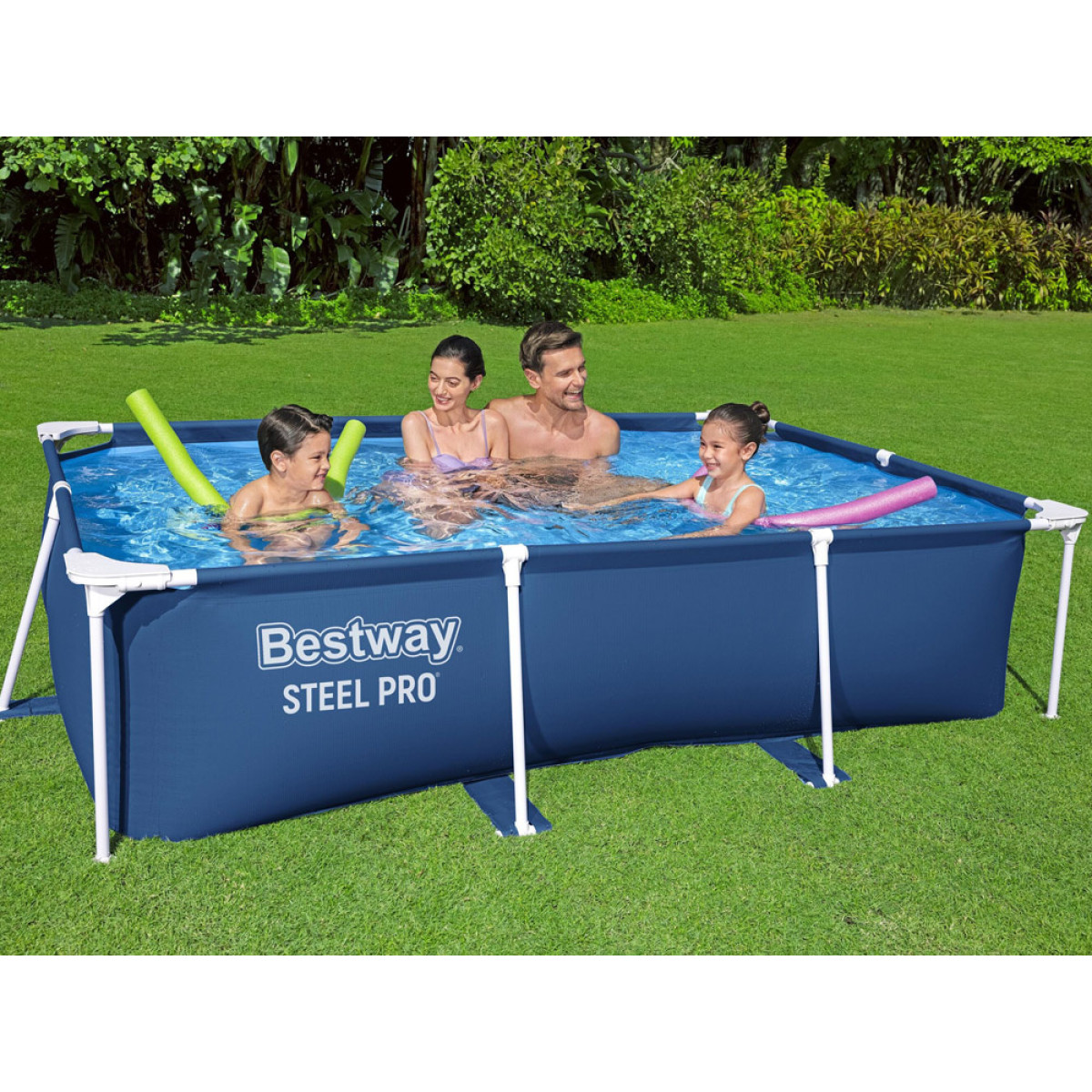 See suur, ristkülikukujuline STEEL PRO™ bassein mõõtmetega 259 x 170 x 61 cm ja 2,300 liitrit vett mahutab kõik lapsed, kes vajavad jahutust. Bassein on valmistatud uusimast Tritech® materjalist, mis on kolmekihiline, tugevdatud ja vastupidav materjal. See koosneb polüestrist võrgusüdamikust, mida ümbritsevad kaks paksu kihti. Tritech® on 15% vastupidavam rebimisele, 33% vastupidavam venitamisele ja 83% vastupidavam läbistamisele kui tavaline PVC.
