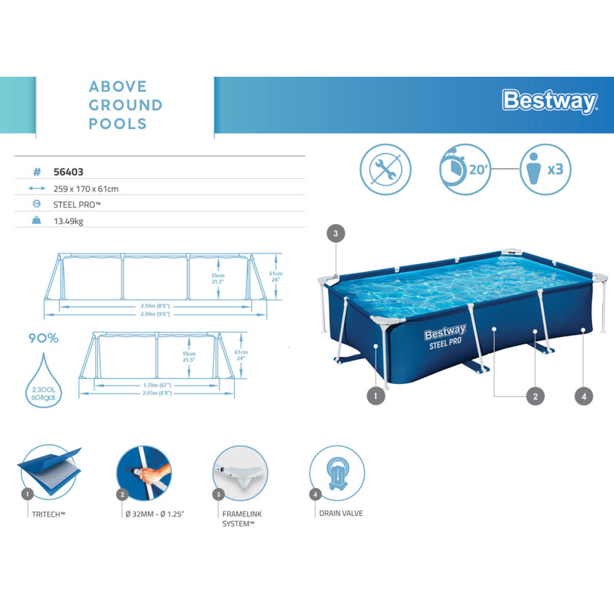 Kõrgeima kvaliteediga, korrosioonikindel terasraam muudab basseini väga stabiilseks. Basseini kokkupanek on äärmiselt lihtne ja kiire, tavaliselt võtab see 2-3 inimesel aega umbes 15-20 minutit ning ei vaja tööriistu! Basseini maht on 2,300L (90% täidetud). Tänu kaasaegsele tehnoloogiale on basseini eluiga pikk.