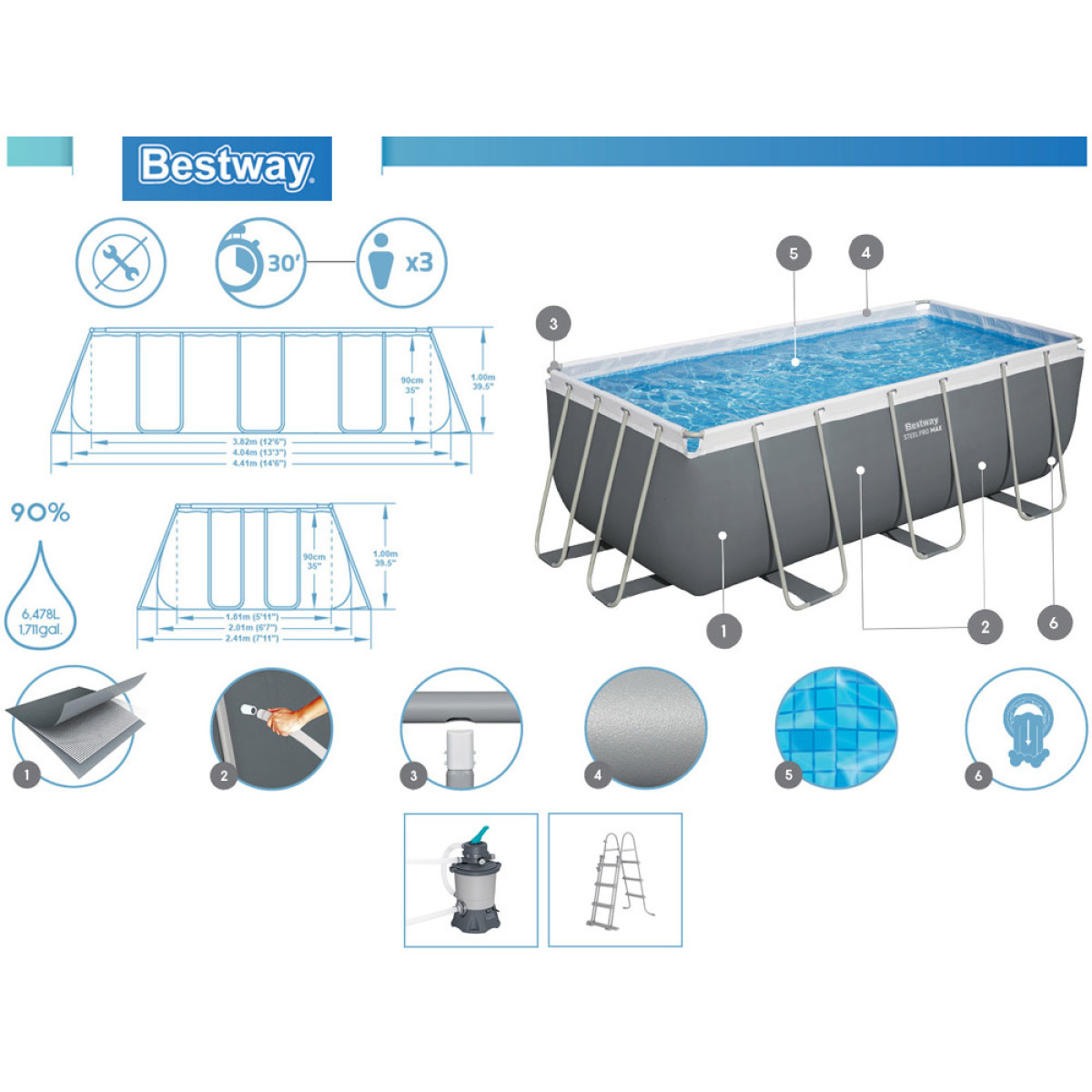 Bestway Steel Pro bassein mõõtudega 404 x 201 x 100cm ja mahutavusega 6,478 liitrit pakub kuumadel suvepäevadel meeldivat jahutust. Selle suurus ja sügavus tagavad mugavuse nii lastele kui ka täiskasvanutele. Metallkonstruktsioon on vastupidav vihmale ja ilmastikutingimustele.
