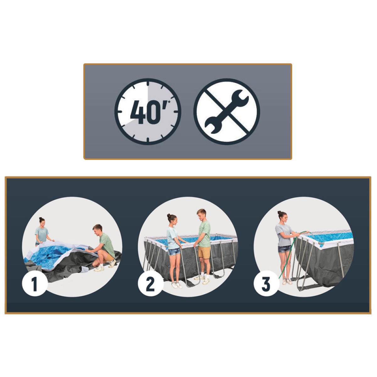 Tritech™ tehnoloogiaga tugevdatud kolmekihilisest materjalist küljed koosnevad polüestri võrgust ja kahest paksust PVC kihist. Bassein on varustatud mugava ja turvalise redeliga, mis võimaldab kiiret ja lihtsat astmete eemaldamist, kui basseini ei kasutata. Bassein mahutab 6,478 liitrit vett, seega on võimalik ka sukelduda.