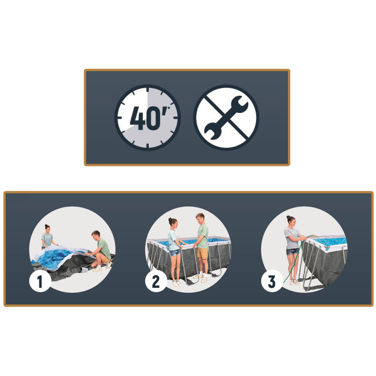 Kolmekihilised, väga vastupidavad külgseinad Tritech materjalist. Kõrge kvaliteediga, korrosioonikindel, tsingitud terasraam annab basseinile stabiilsuse. Kiirkinnitused voolu juhtimiseks. Väga lihtne ja kiire paigaldus, mis kestab tavaliselt 2-3 inimesel umbes 30 minutit. Paigaldus ei nõua tööriistu!