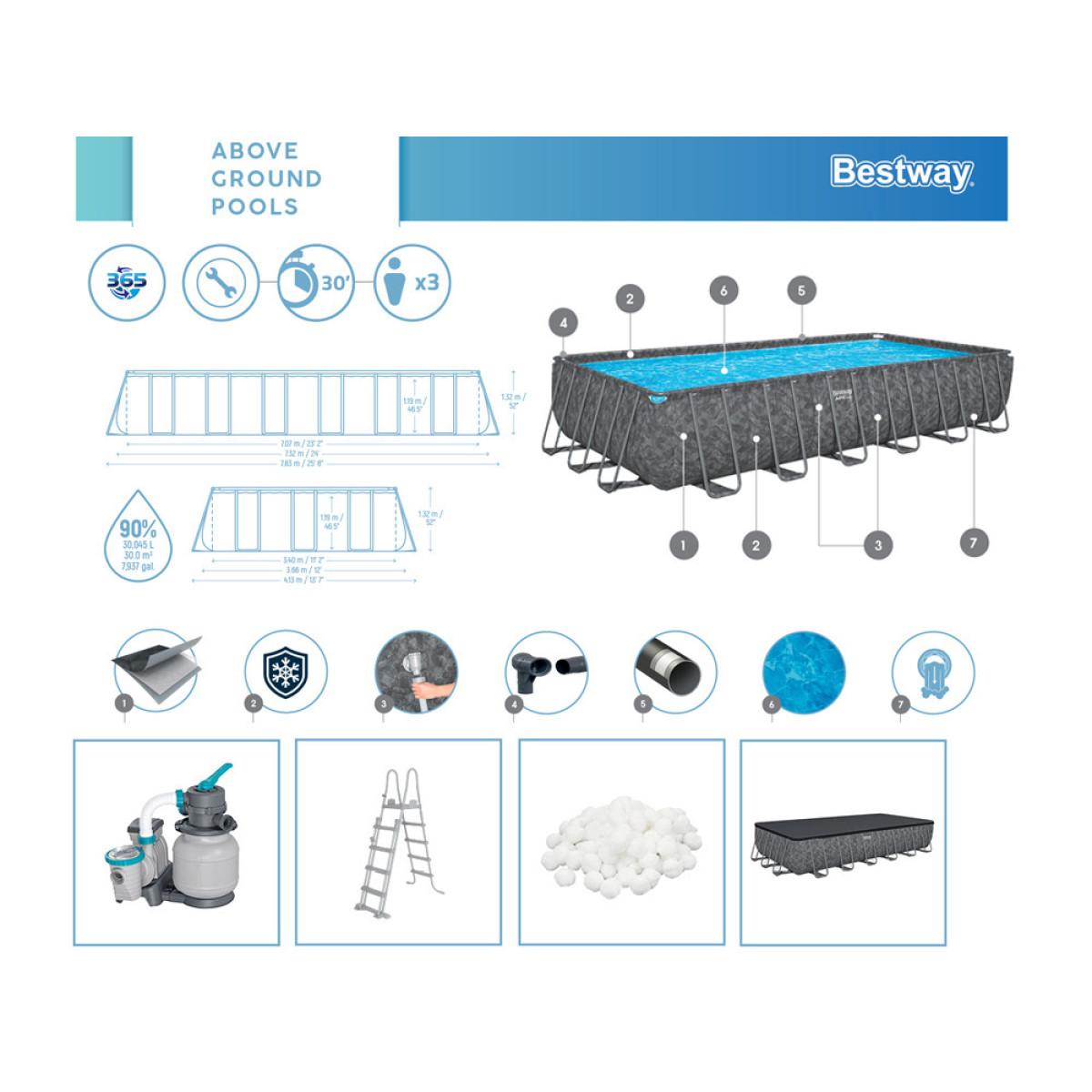 - Bassein mõõtmetega 732 cm x 366 cm x 132 cm