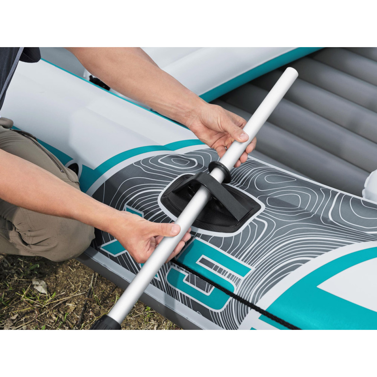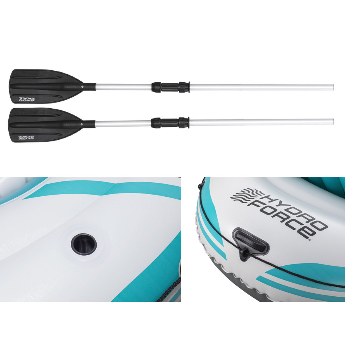Lisatarvikud: Komplekt sisaldab tugevaid aerusid, sisseehitatud ridvahoidjaid ja klambreid, mis hoiavad aerud kindlalt paigal. Samuti on olemas mootorikinnitused, mis sobivad 1,5 HP (1,1 kW) mootorile (mootor ja kinnitus ei kuulu komplekti).