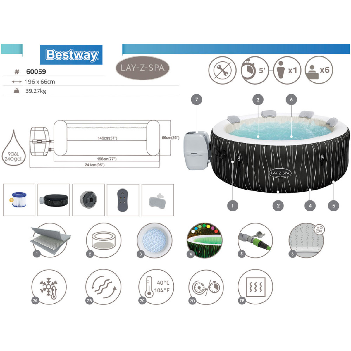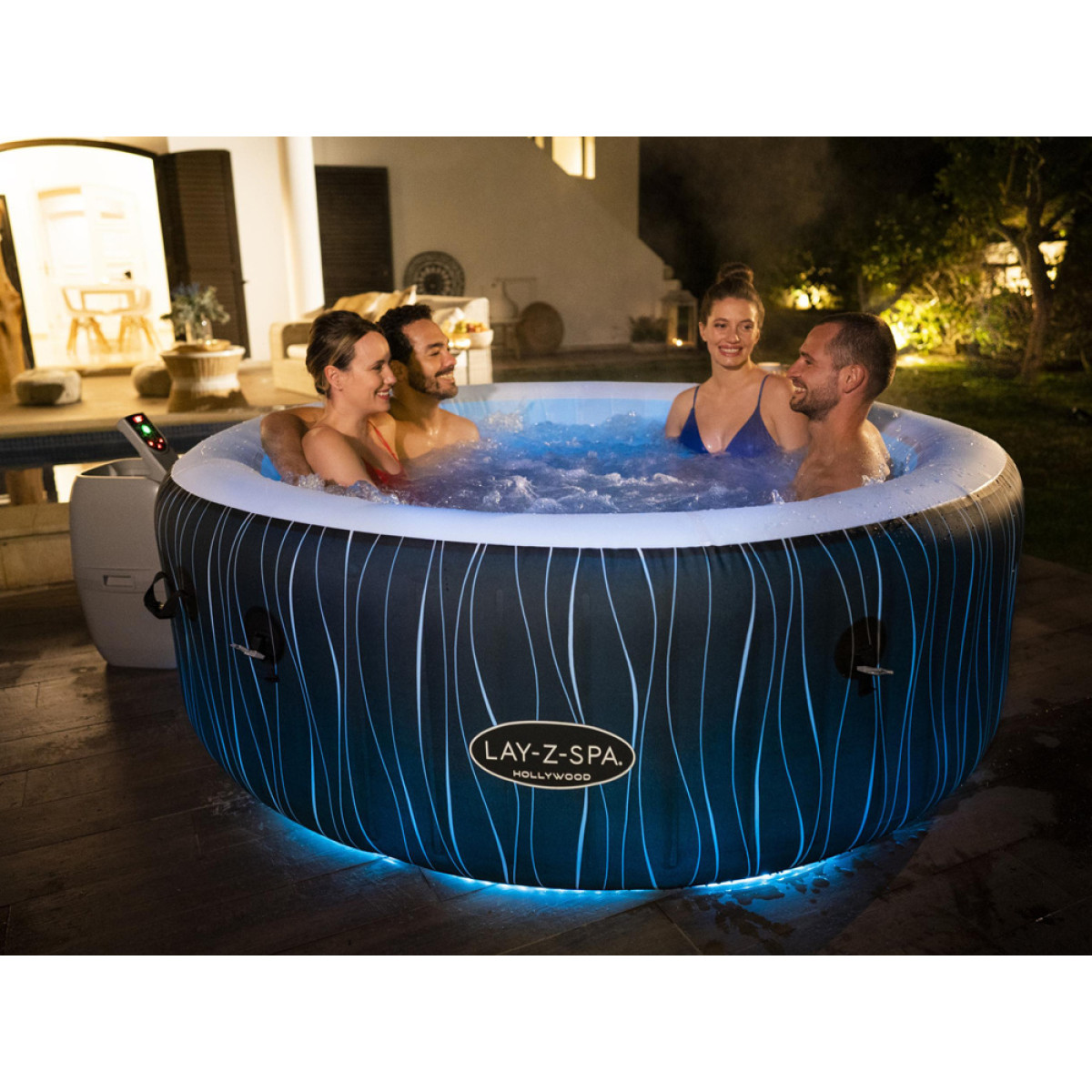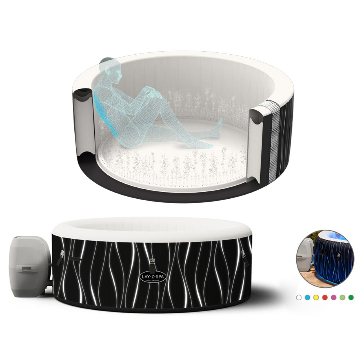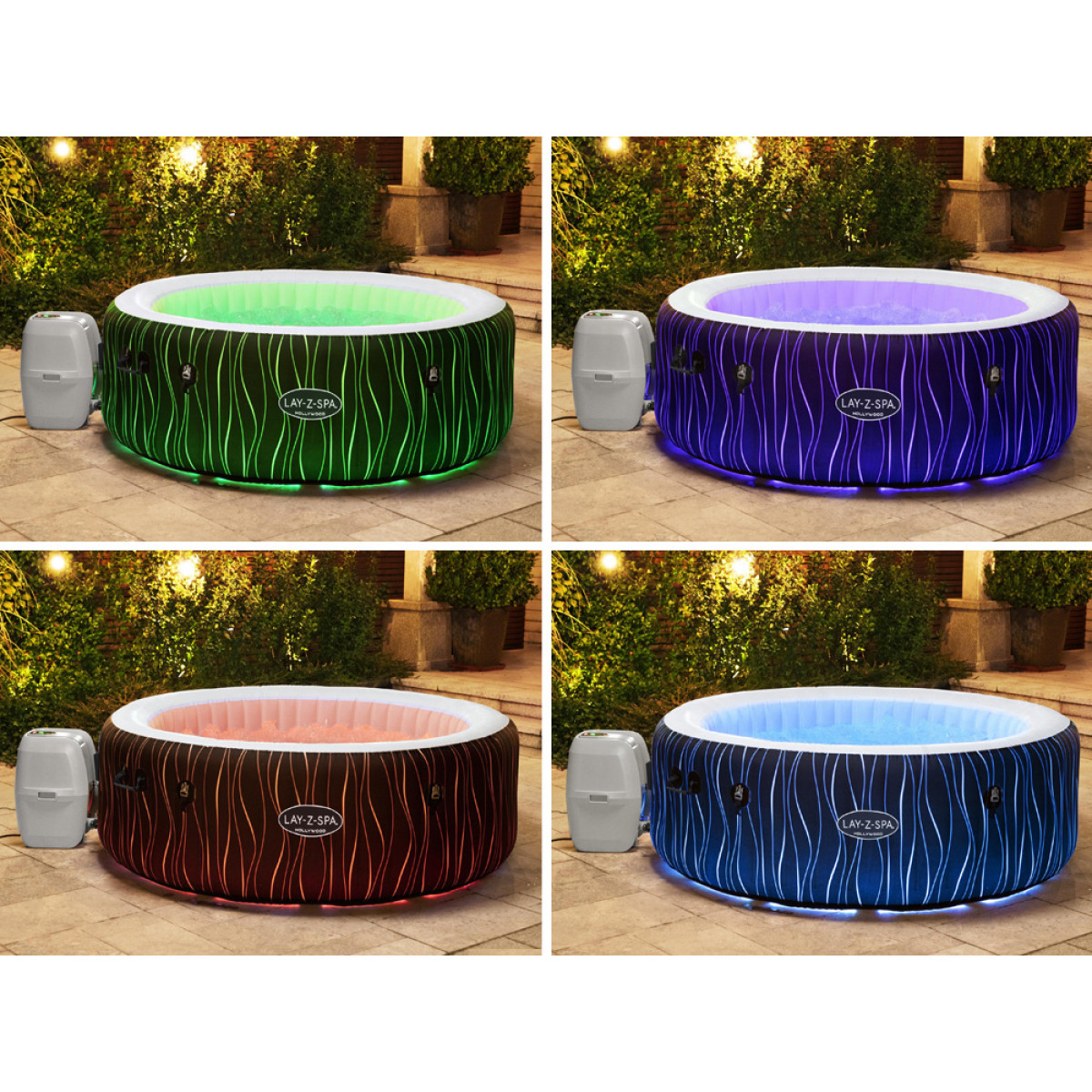 Bestway Lay-Z-Spa HOLLYWOOD™ on täispuhutav mullivann, mis sobib ideaalselt neile, kes hindavad luksuslikku puhkust ja samal ajal privaatsust. See tagab mugava lõõgastuse pärast pikka päeva. Lay-Z-Spa Hollywood™ mudeliga saate tunda end nagu parimas spaakeskuses otse koduaias. Täispuhutav spa on varustatud mitmevärvilise LED-valgustusega, mida saab juhtida kaugjuhtimispuldiga. Valida saab kuni 7 värvi vahel. LED-tuled valgustavad vee läbi poolläbipaistva voodri, pakkudes veelgi unikaalsemaid elamusi. Lisaks on komplektis 4 peapadja, mis tagavad täiendava kasutusmugavuse. Tuhanded massaažimullid, sobiv vee temperatuur ja efektne valgustus lõõgastavad keha ning pakuvad hetke puhkamiseks.