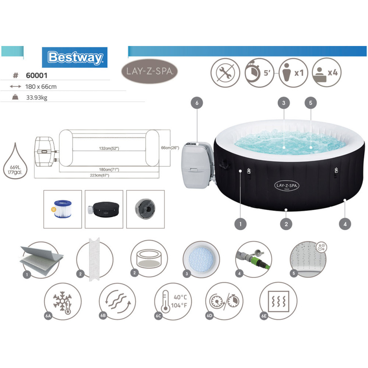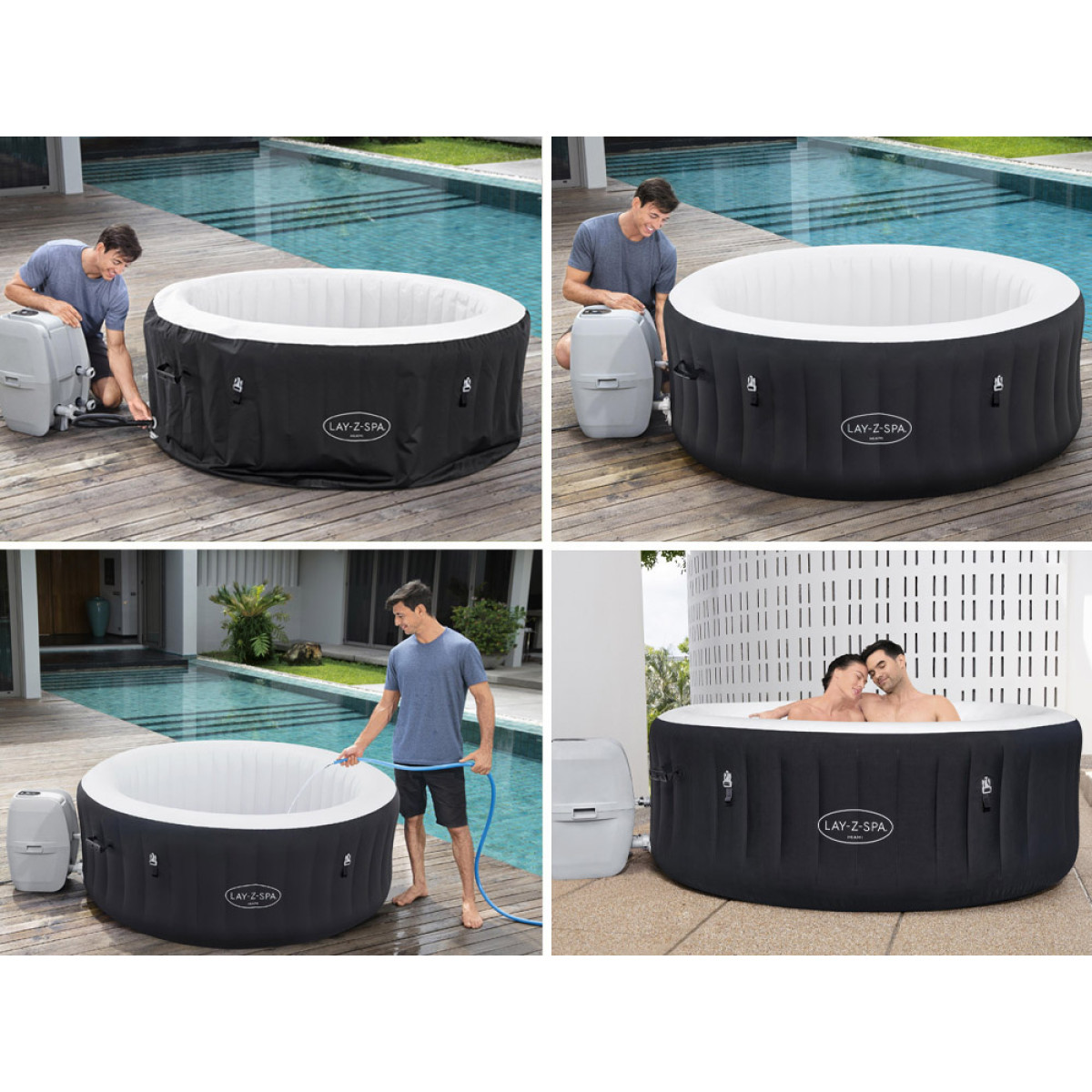 Lay-Z-Spa Miami AirJet sobib paigaldamiseks igale tasasele pinnale - kodus, terrassil või aias. Selle pehmendatud põhi, puhutavad seinad ja vastupidav konstruktsioon pakuvad suurepärast stabiilsust ja mugavust. Kunstkattega kate ja puhutav kaas pakuvad täiendavat kaitset ja isolatsiooni. Valige Lay-Z-Spa Miami AirJet lõõgastuseks, mugavuseks ja mitmekülgsuseks taskukohase hinnaga.