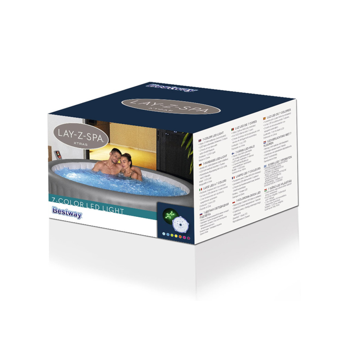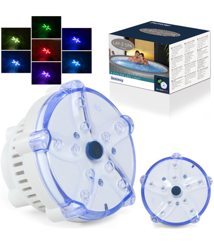 LED-valgusti on suurepärane lisand, mis muudab koduse Lay-Z-Spa romantilise õhtu veelgi meeldejäävamaks. Selle kasutamine on lihtne ja sellel on seitse värvirežiimi. Värve saab vahetada ülemise nupu abil. Valgusti on täiesti ohutu ja veekindel ning töötab 3xAAA patareidega.