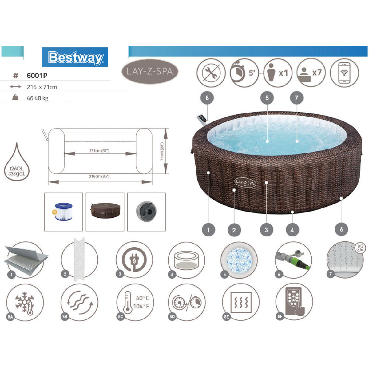 Seda spaat saab juhtida mobiilseadmega Bestway SmartSpa™ rakenduse kaudu. See innovatsioon muudab Bali Smart AirJet 7 üheks turu mugavaimaks spaaks. Rakendus võimaldab seadistada ideaalse spa temperatuuri, aktiveerida energiasäästu ajastaja, käivitada veefiltri ja juhtida massažisüsteemi - kõik käeulatuses!