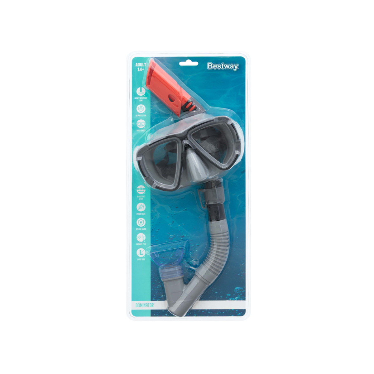 Bestway Dominator Snorkel Mask komplekt on loodud veealuste seikluste armastajatele ning sobib ideaalselt 14-aastastele ja vanematele ujujatele. Komplekt sisaldab maski ja hingamistoru, mis tagavad mugavuse ja turvalisuse snorgeldamisel, sukeldumisel või veemängudel. Tänu polükarbonaadist valmistatud läbipaistvatele läätsedele pakub mask suurepärast nähtavust, samal ajal kui UV-kaitsekiht kaitseb silmi kahjuliku päikesekiirguse eest. Mask sobib hästi nii ookeanis, järves kui ka koduses basseinis kasutamiseks.