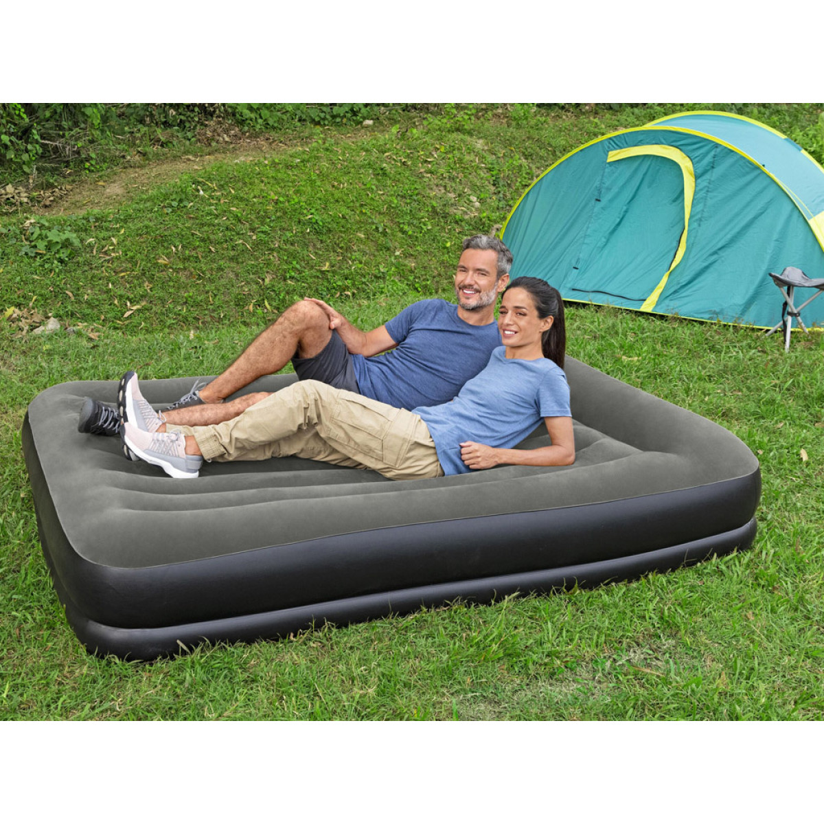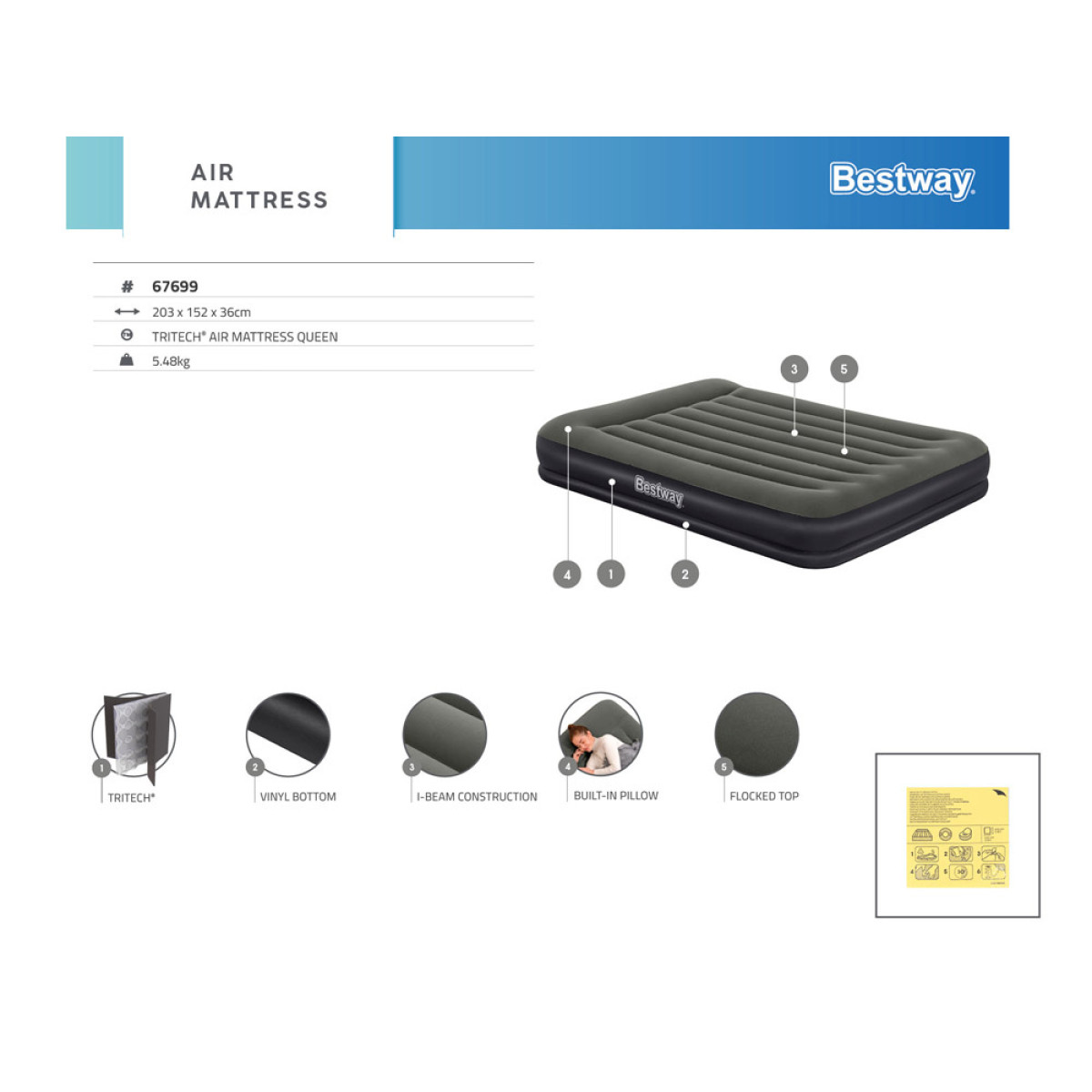 Bestway kaheinimese täispuhutav madrats Queen Tritech on loodud neile, kes hindavad mugavat puhkust ja naudivad looduses viibimist. Selle Tritech™ sisemine tugisüsteem on 44% vastupidavam venimisele, talub 19% suuremat survet ja on 18% tugevam kui tavaline PVC. Isegi kui madratsil on korraga mitu inimest, jaotub raskus ühtlaselt kogu pinnale. Täiendavaks eeliseks on sisseehitatud padi.