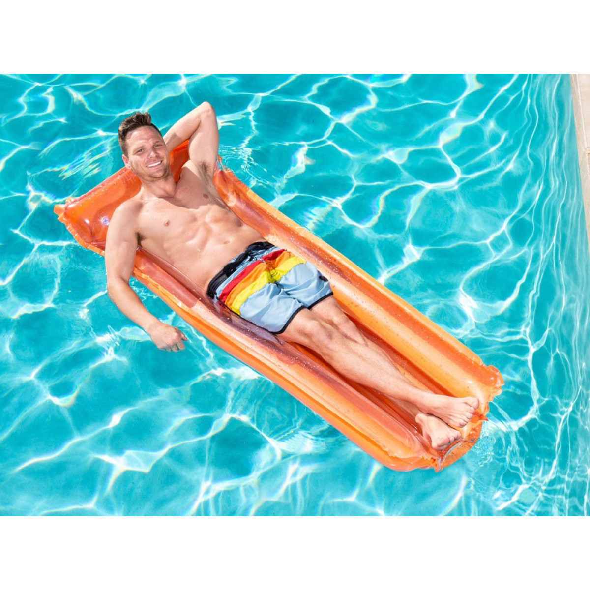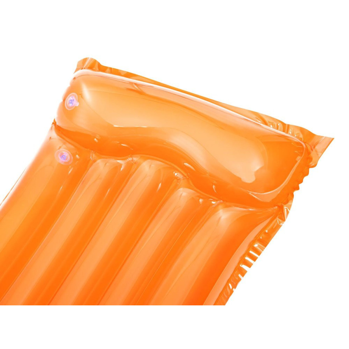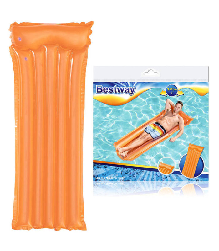 See täispuhutav oranž rannamadrats on suurepärane valik vabas õhus puhkuse nautijatele. Lihtne ja värvikas veelepik on kohustuslik elementi veekogu ääres või basseini puhates. See mudel suudab kanda kuni 90 kg kaaluvat inimest, mistõttu sobib see nii lastele kui ka täiskasvanutele. Täispuhutav peatoega ujumismadrats mõõtmetega 183 cm x 76 cm on valmistatud pehmest, kuid vastupidavast PVC-materjalist. Suvelised värvikad toonid teevad selle toote iga ranna tõmbenumbriks.