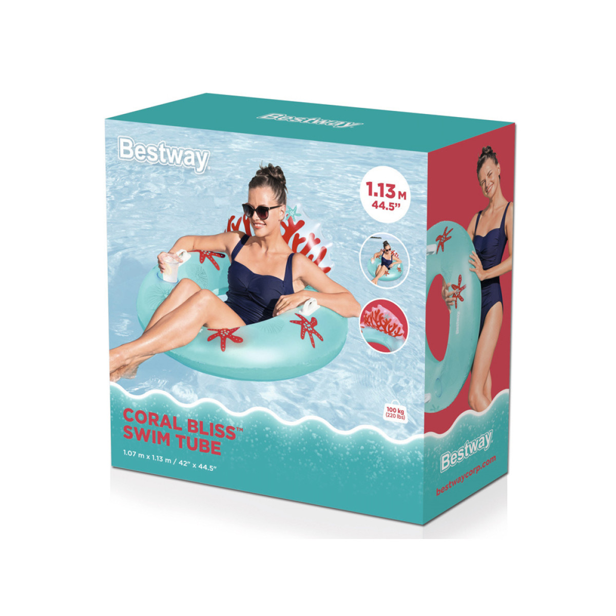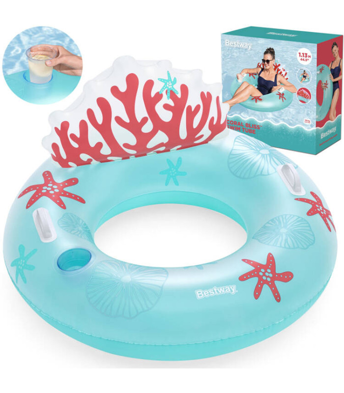 Bestway täispuhutav ujumisrõngas seljatoega, käepidemetega ja joogitopsihoidjaga korallrahu kauni graafikaga võimaldab lõõgastuda puhkuse ajal. Selle ilus disain ja meeldivad värvid püüavad iga mere või basseini armastaja pilku. Rõngas on varustatud kahe vastupidava käepidemega, mis muudavad peale- ja mahaminekud lihtsaks, ning sisse ehitatud topsihoidjaga - süvend, kuhu saab asetada kruusi, pudeli või purgi, nii et ei pea katkestama lõõgastust lemmikjoogi järele haaramiseks.