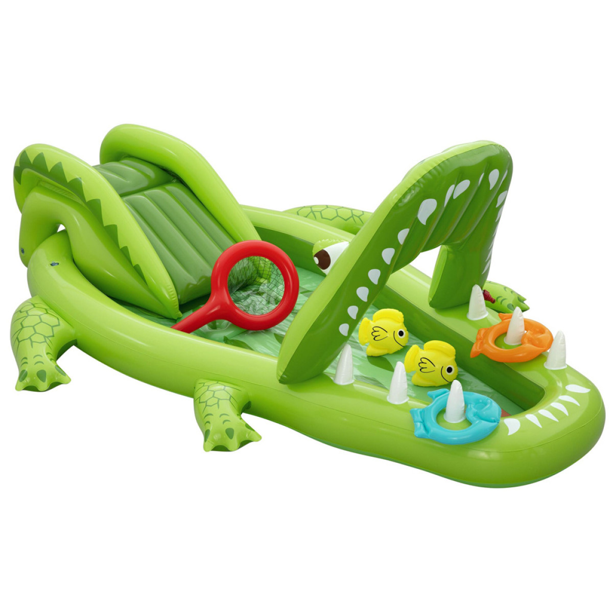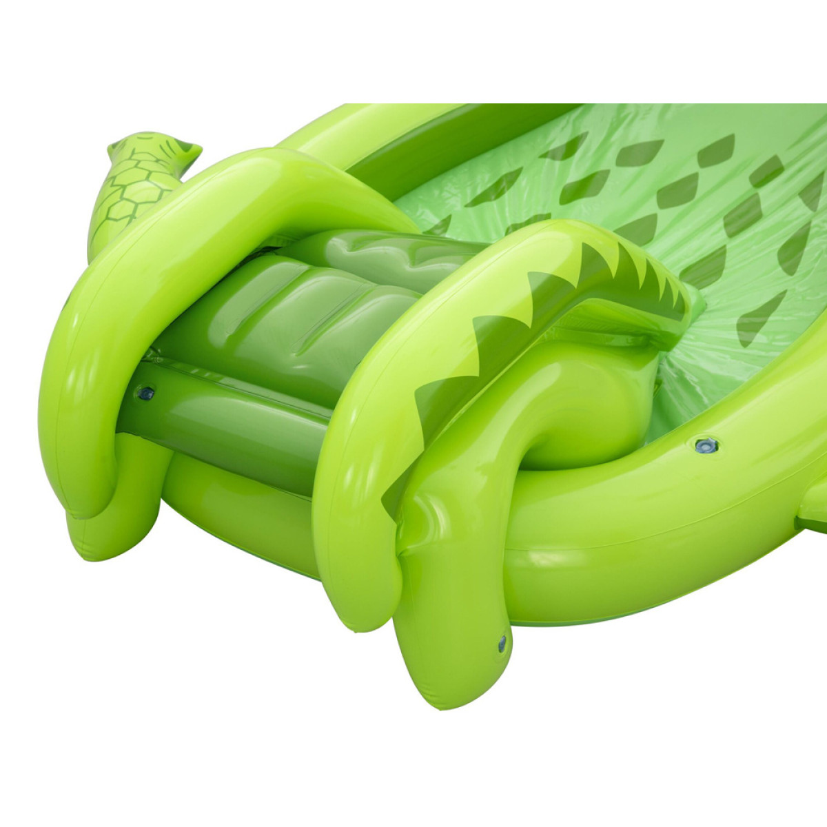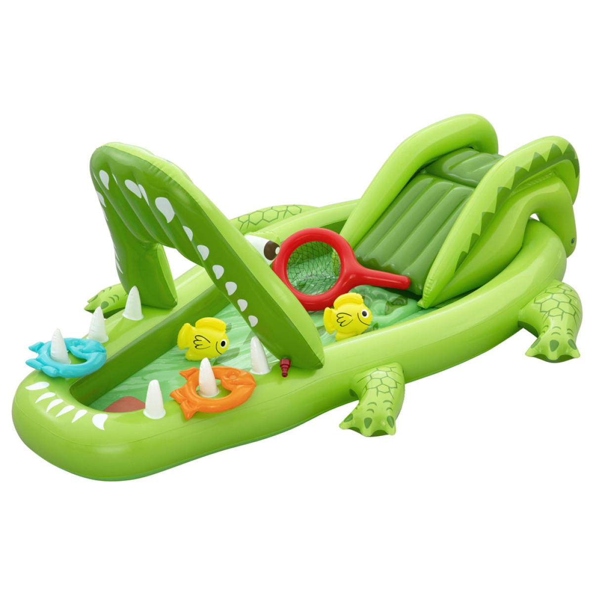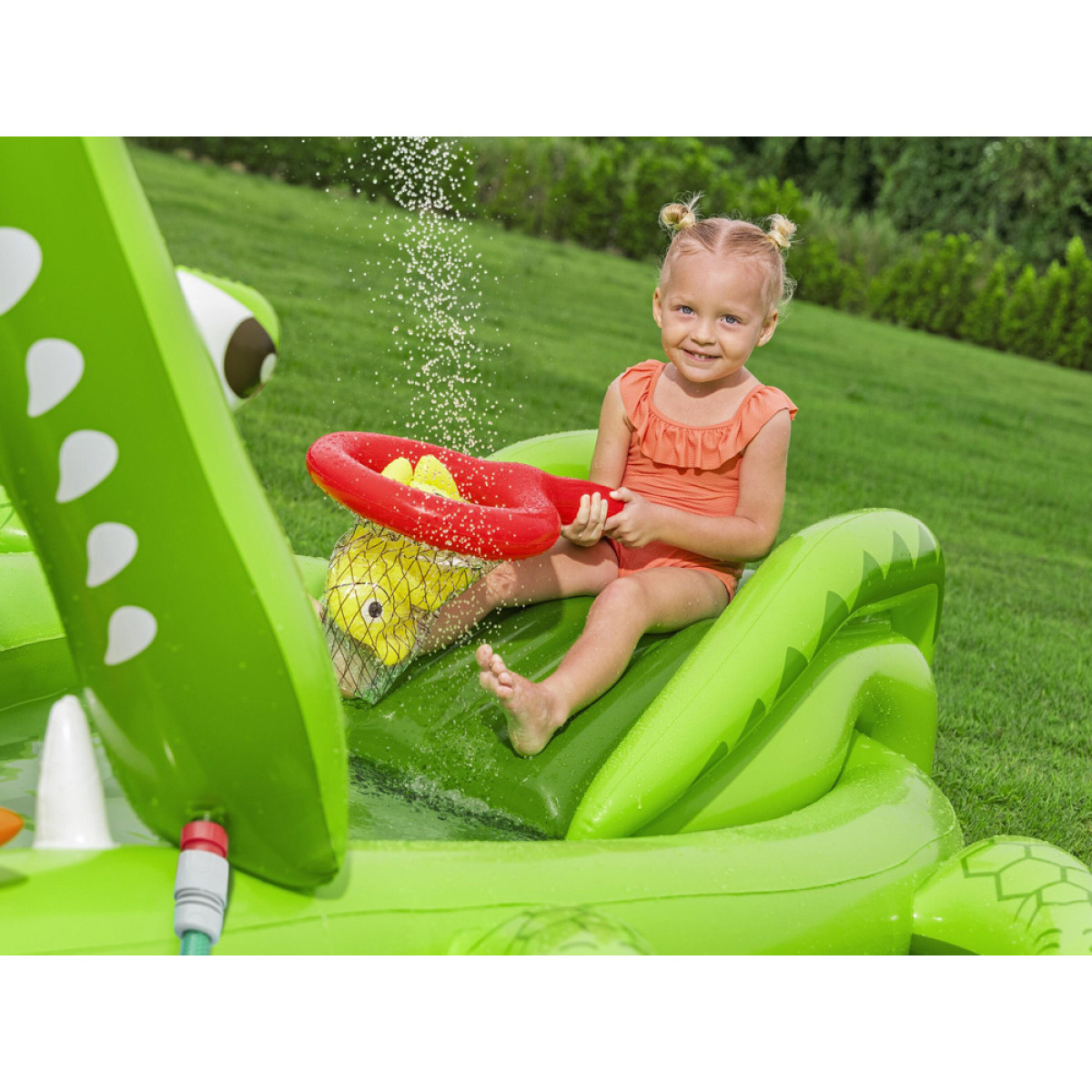 Lapsed saavad nautida liumäge, mis lõpeb pehme maandumisalaga, pakkudes turvalist laskumist veebasseini. Aligatori ninasse paigaldatud pihusti pritsib vett liumäe suunas, suurendades atraktsiooni ja jahutust kuumadel päevadel. Mänguväljakut rikastab täispuhutav kalavõrk Puffy Pal™ ja rõngaviske mäng, kus kasutatakse kahte täispuhutavat rõngast kalade ja aligatori hammaste kujul, arendades laste täpsust, osavust ja refleksi.
