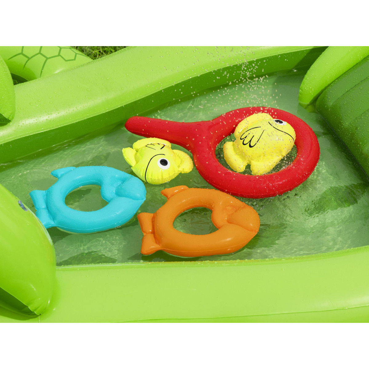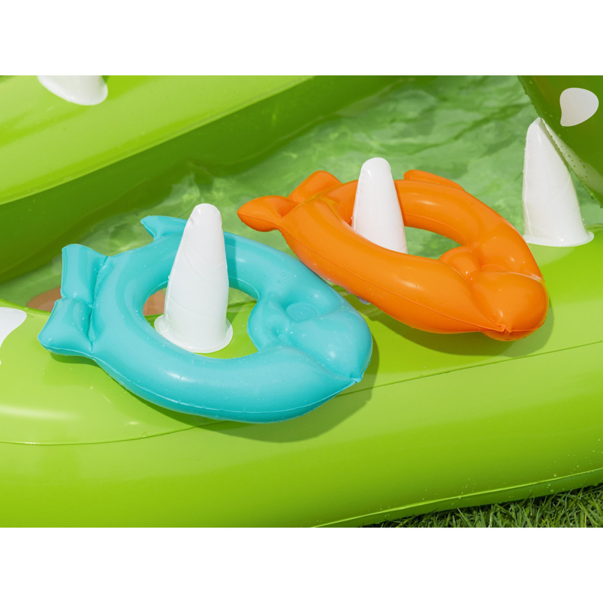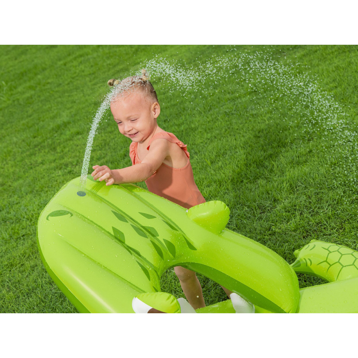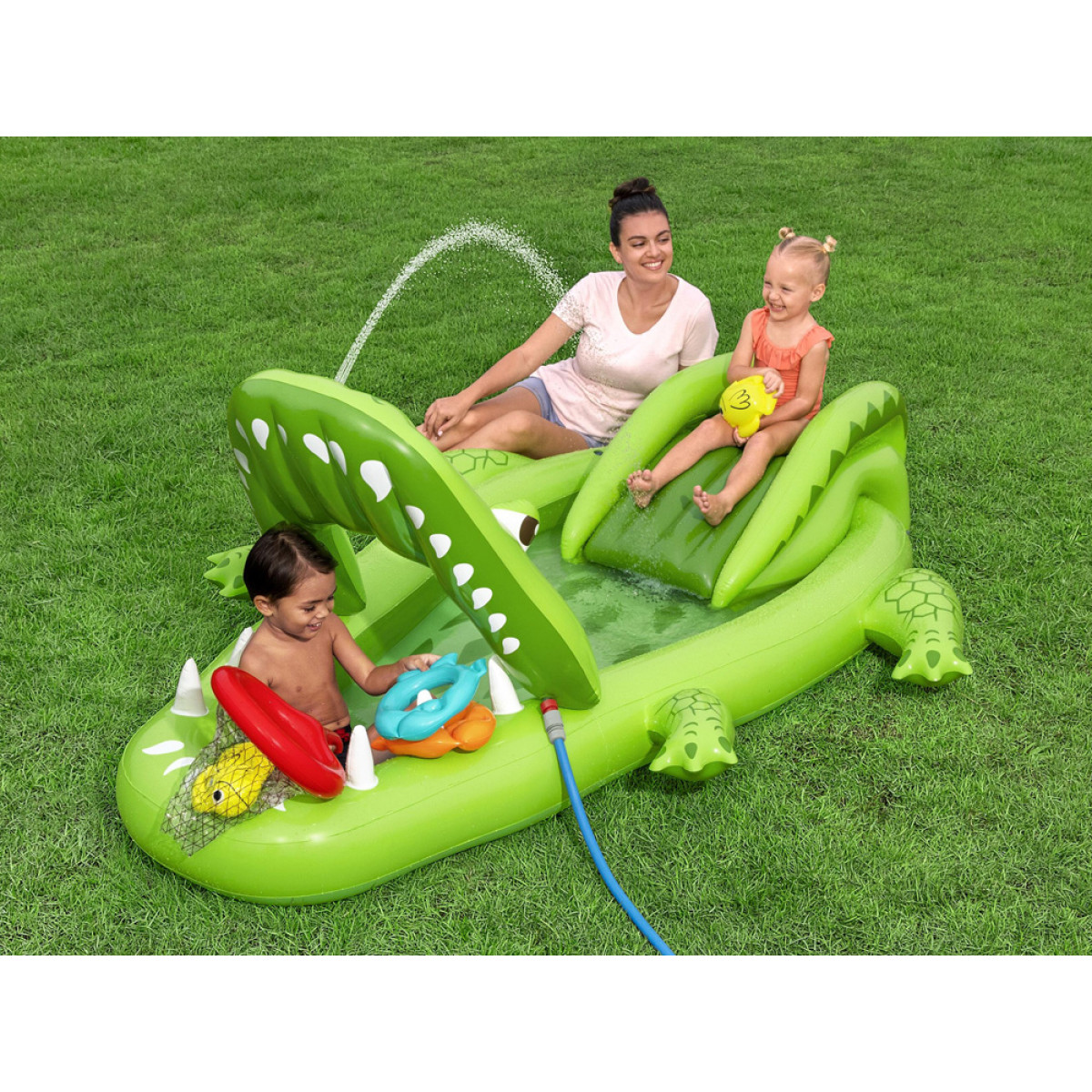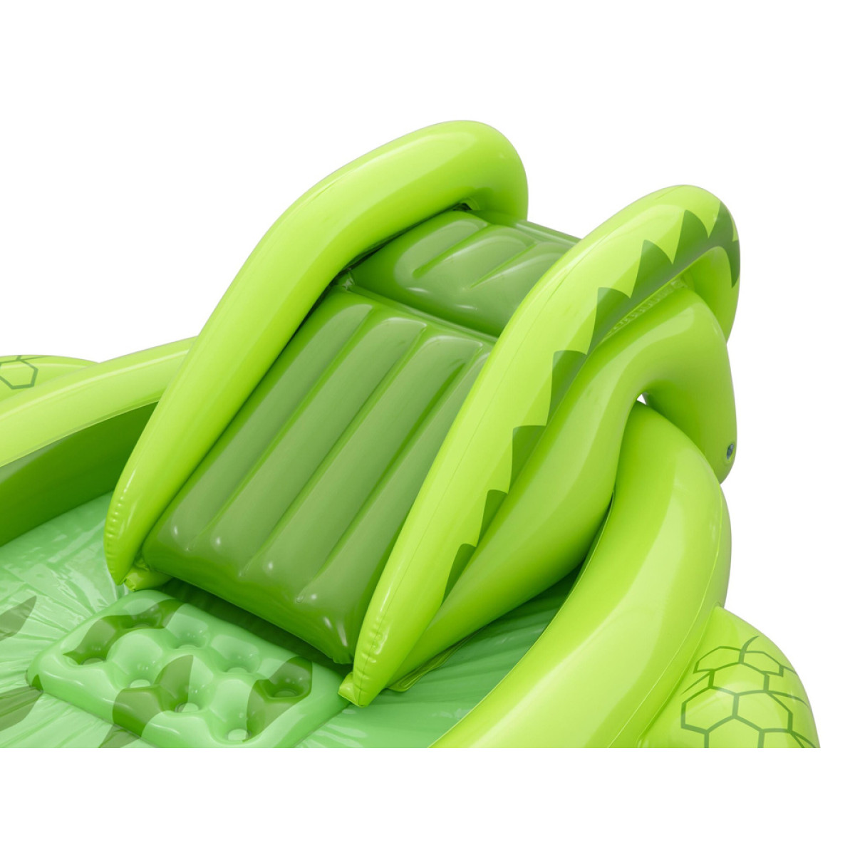 Lapsed saavad nautida liumäge, mis lõpeb pehme maandumisalaga, pakkudes turvalist laskumist veebasseini. Aligatori ninasse paigaldatud pihusti pritsib vett liumäe suunas, suurendades atraktsiooni ja jahutust kuumadel päevadel. Mänguväljakut rikastab täispuhutav kalavõrk Puffy Pal™ ja rõngaviske mäng, kus kasutatakse kahte täispuhutavat rõngast kalade ja aligatori hammaste kujul, arendades laste täpsust, osavust ja refleksi.