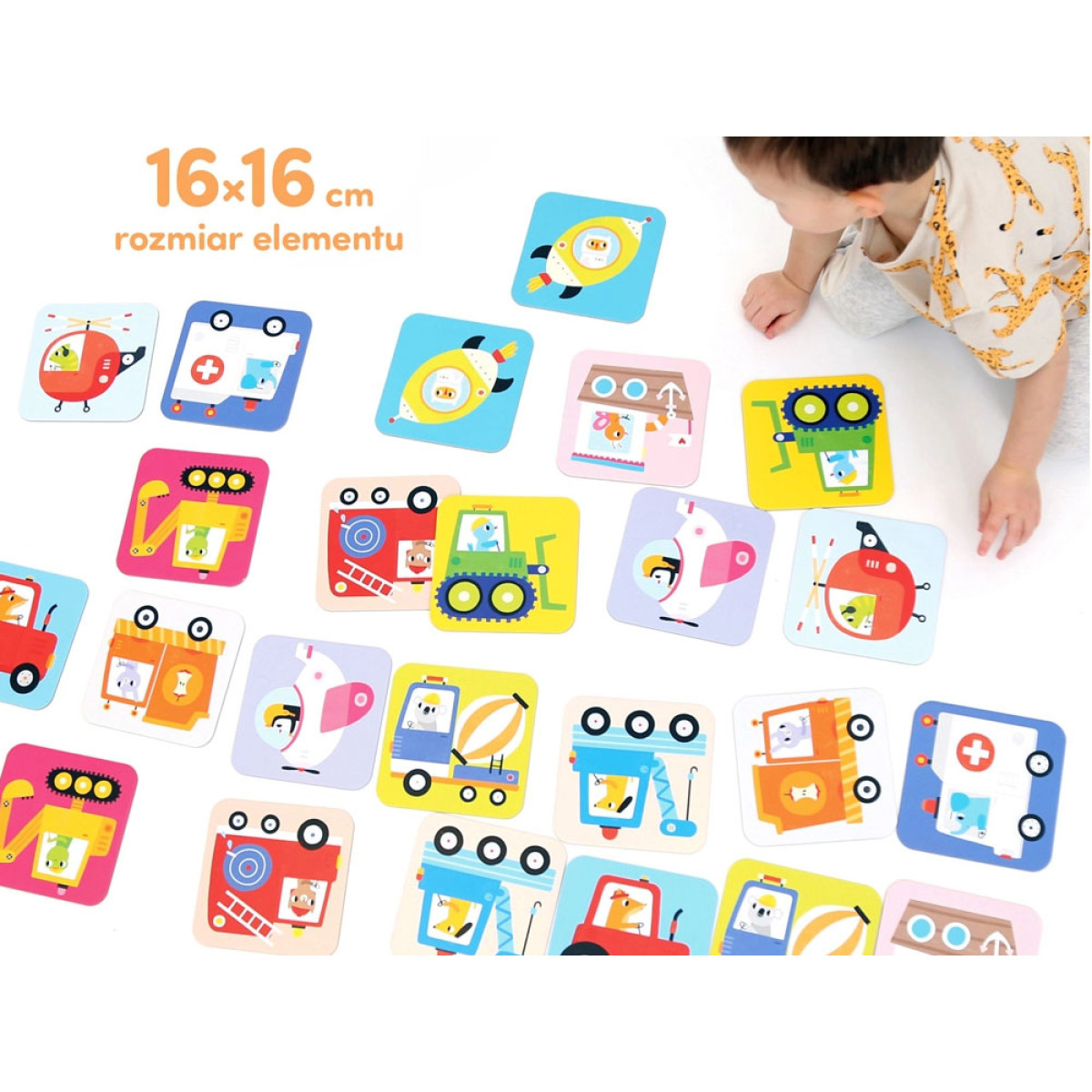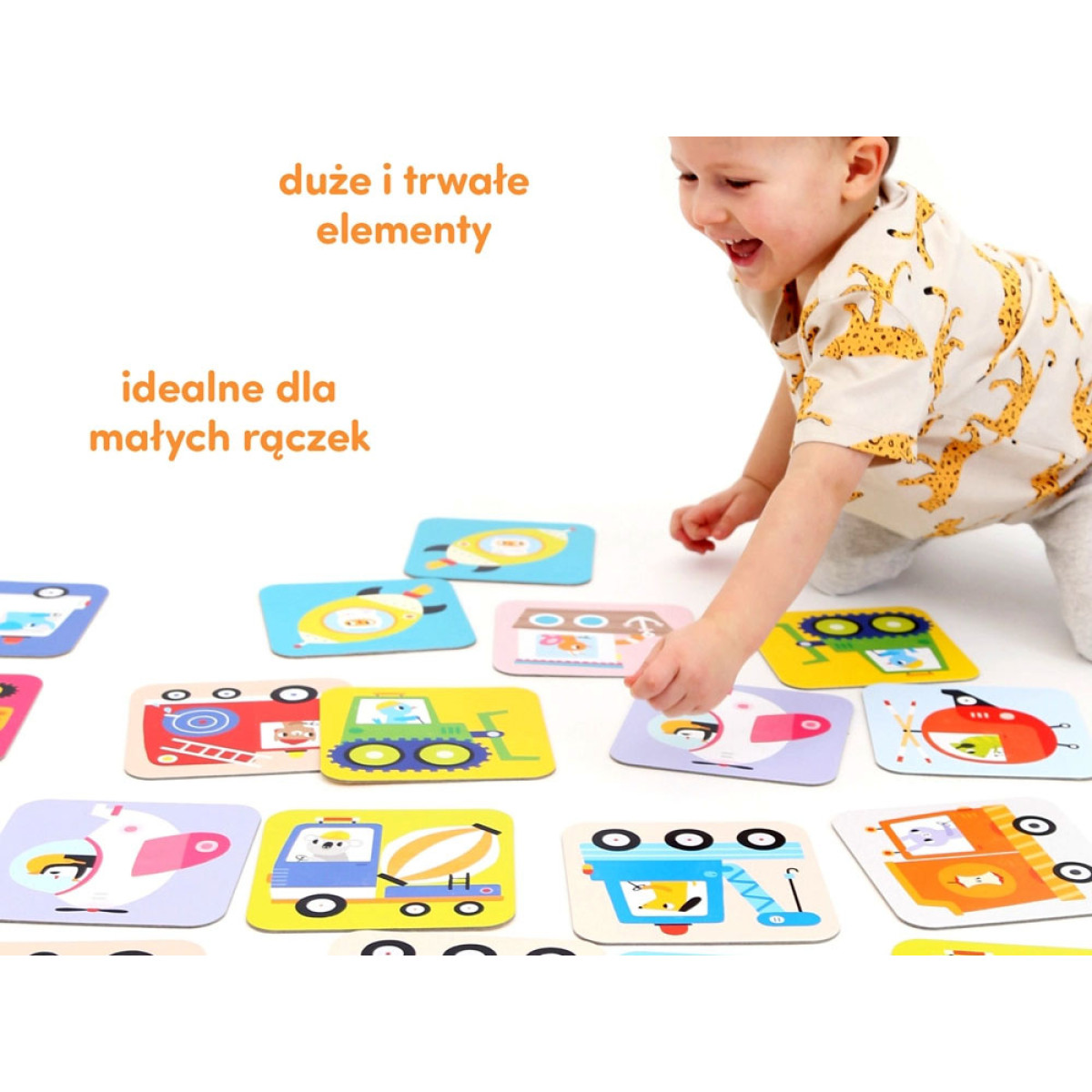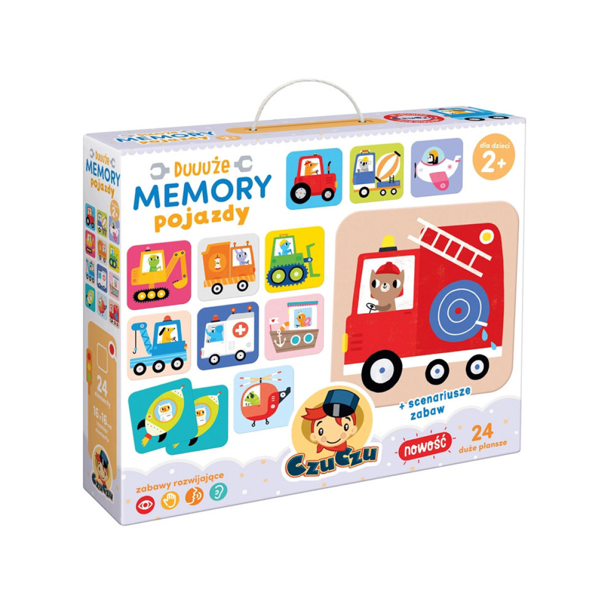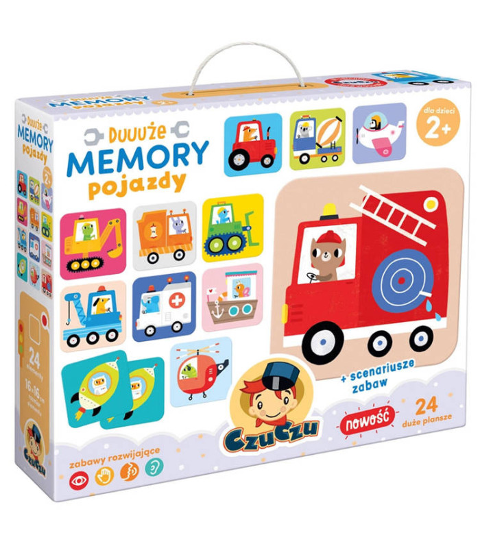 CzuCzu Suur Memory Mäng Sõidukid on hariv mäng, mis aitab lastel arendada mälu, keskendumisvõimet ja teravust. Hariduslik komplekt sisaldab tõeliselt suuri, kaunilt illustreeritud elemente. Raskusastet saab kohandada lapse oskuste järgi, alustades mängu kahe või kolme paariga ning lisades järk-järgult uusi sõidukeid. Mängulaudu saab kasutada mitmel erineval viisil - komplektiga on kaasas juhend 28 hariva mängustsenaariumiga.