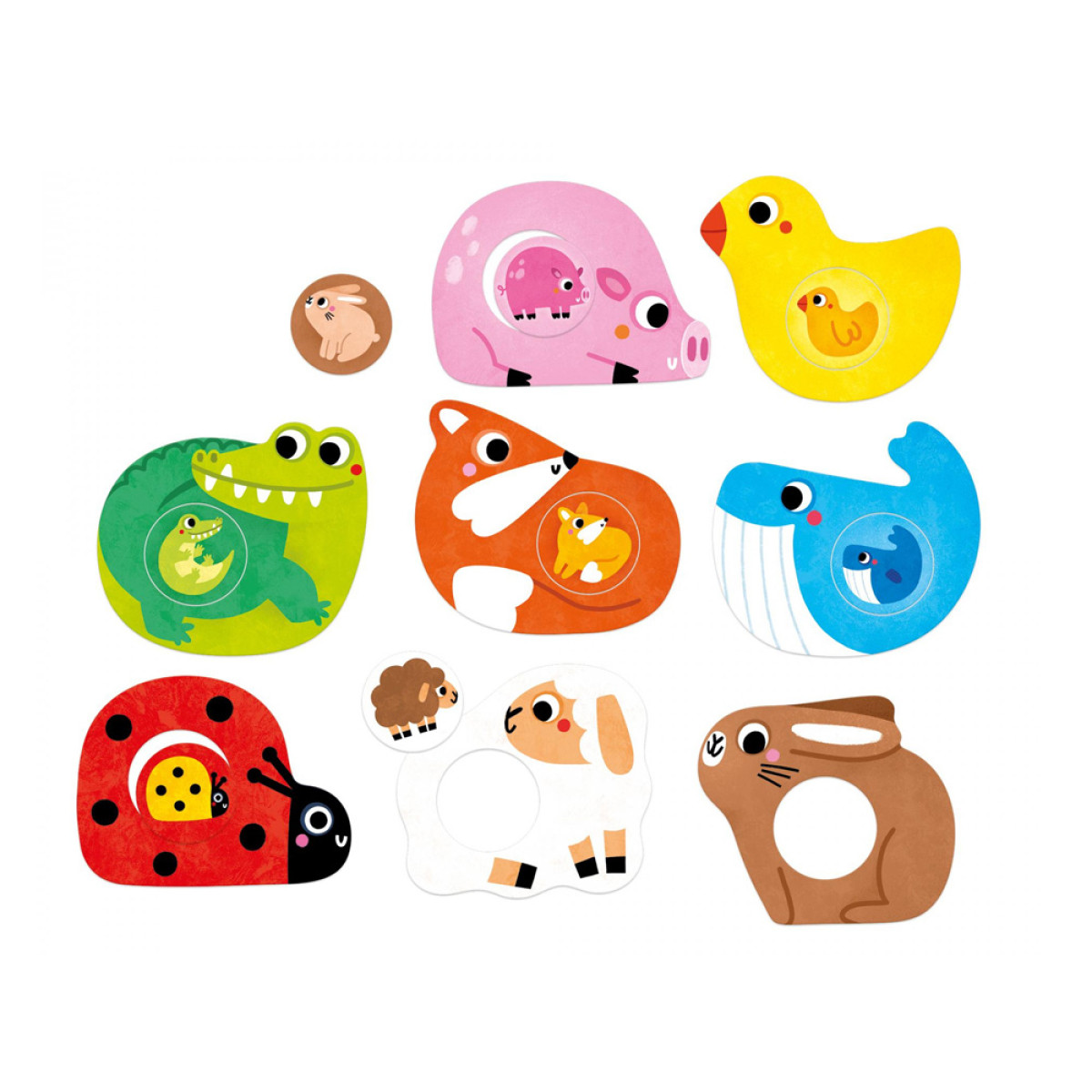 Mänguretsept: Alustage rõngaste väljalükkamisest – see on juba lõbus! Näita lapsele, kuidas elemente sobitada, nimeta loomi, värve ja kujusid. Võrrelge neid, matkige tegelaste helisid ja liigutusi. Selliste tegevuste kaudu harjutab laps osavust, keskendumist ja loovust. Vaja on vaid natuke kujutlusvõimet, et pusledest saaks tõeline seiklus!