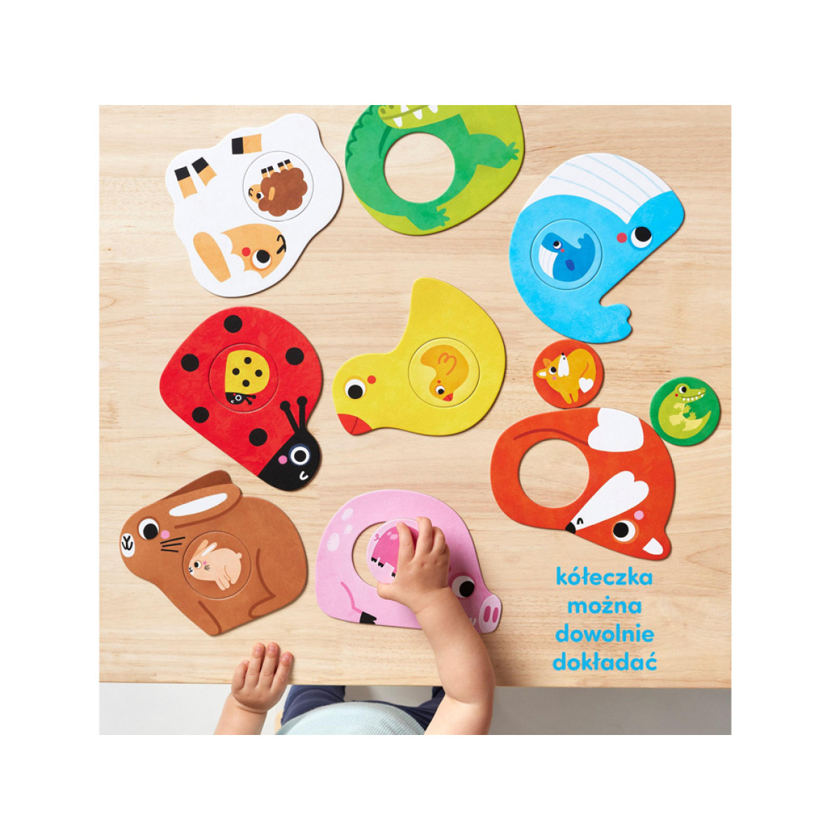 Lõbus mäng! Suured, värvilised, kaheosalised pusled kujutavad sõbralikke loomakesi ja on loodud noorte avastajate jaoks. Mäng hõlmab rõngaste sobitamist õigetesse tahvlitesse – lihtsam kui traditsioonilised pusled ja pakub palju rõõmu. Elemendid saab ühendada mitmel viisil: ees, taga ja isegi erinevate puslede vahel! Iga õige ühendus on uhkuse allikas ja innustab edasiseks mänguks.