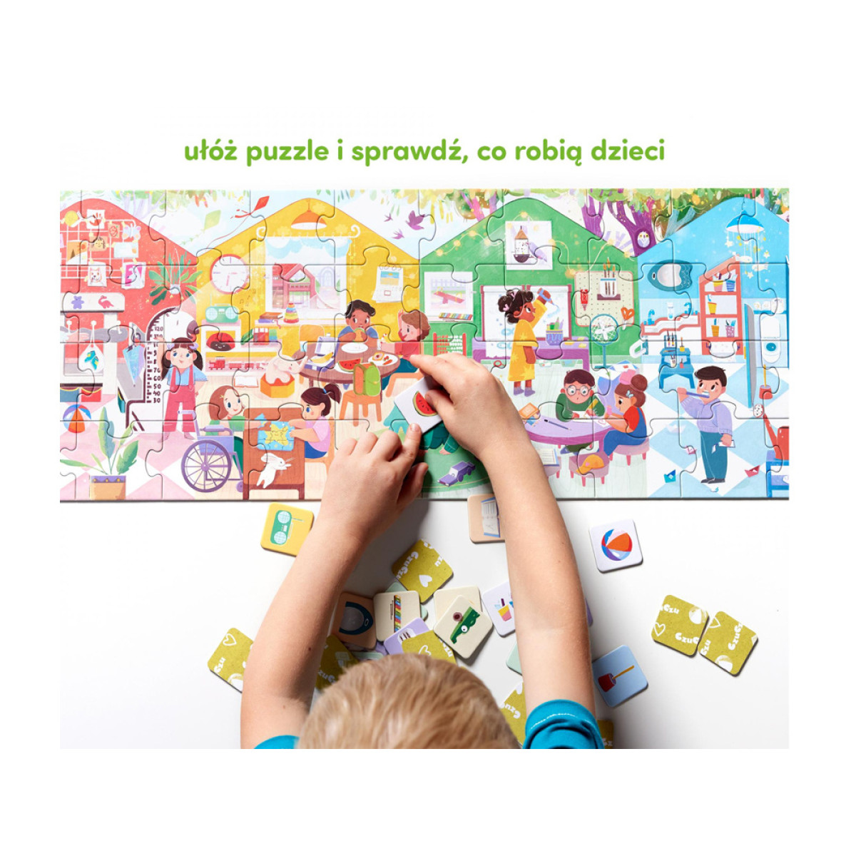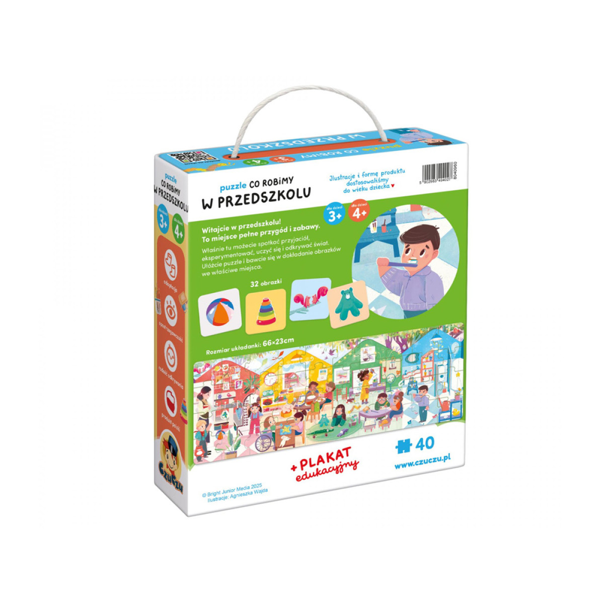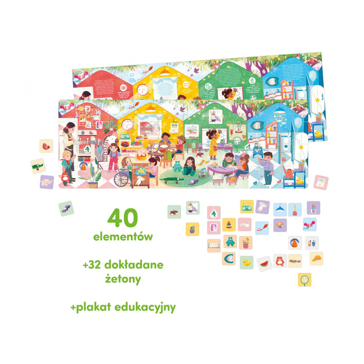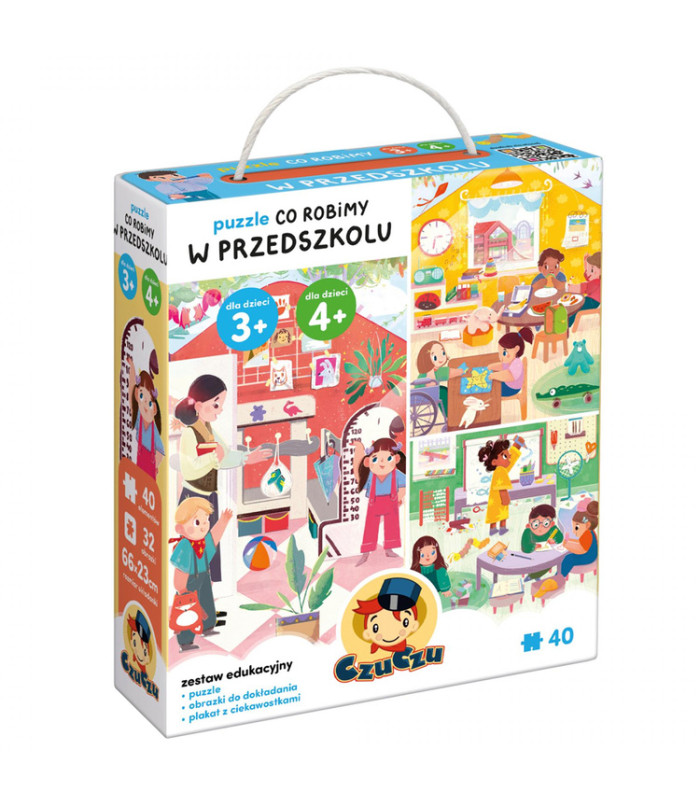 Värviküllane ja detailne pusle, mis koosneb 40 tükist, viib lapsed rõõmsasse lasteaia maailma. Avastage erinevad ruumid ja vaadake, millega lapsed päeva jooksul tegelevad! Täiendavad 32 detailset kaarti pakuvad kaasahaaravat tähelepanumängu, ning plakat huvitavate faktide ja tegevusideedega aitab väikelastel (ja vanematel) lasteaia maailmaga harjuda.