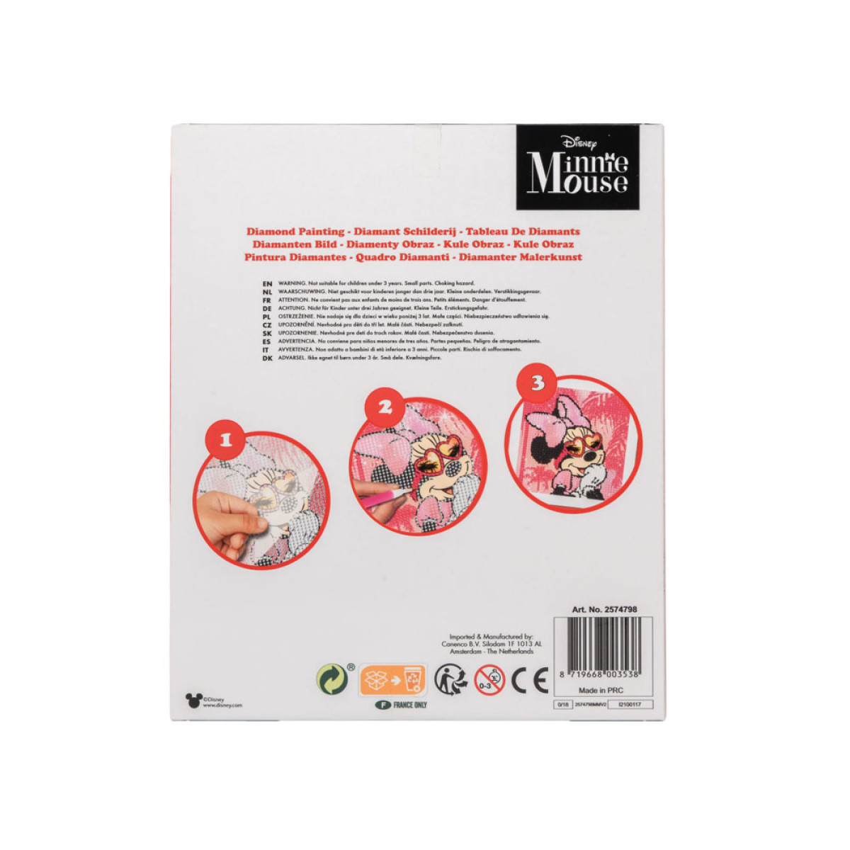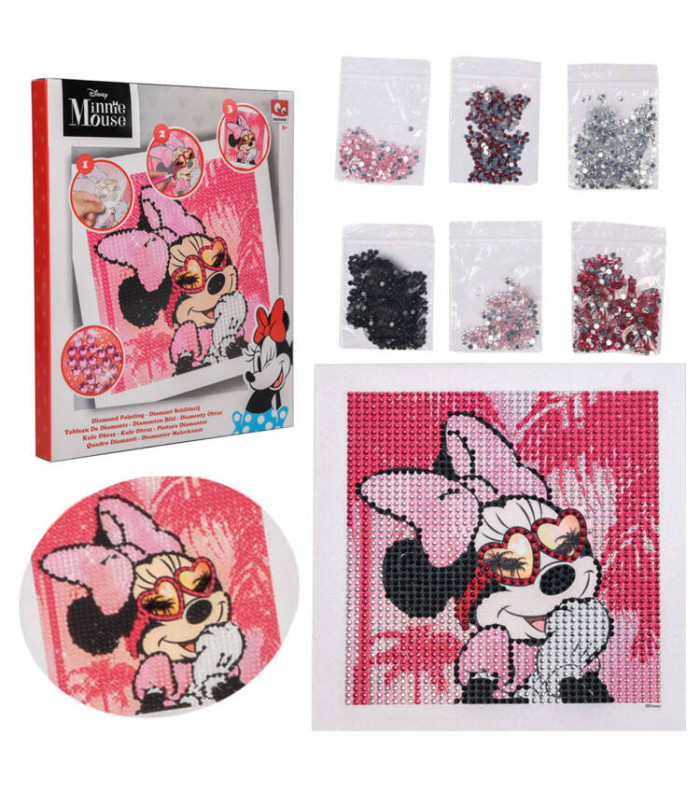- rõõmsameelse Miki Hiire pilt, kaetud liimiga, mis kergendab teemantide paigaldamist. Pildi peal on trükitud tähed, et hoida värvide järjekorda. Kuid tegelikult sõltub sinust, milline on sinu Miki Hiire lõpptulemus.