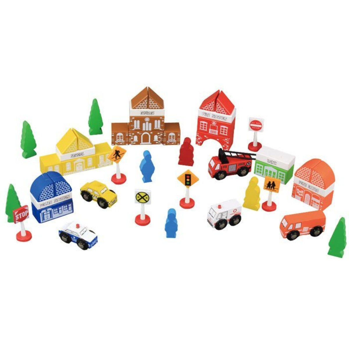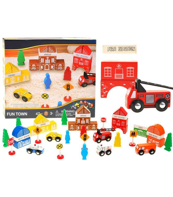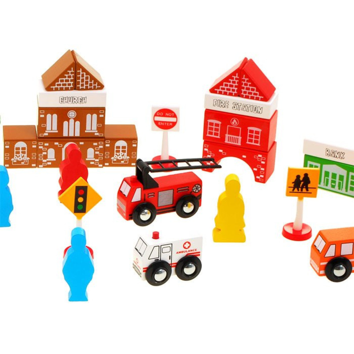 Tutvustame erakordseid puidust klotse. Komplekt sisaldab 47 elementi, millest saab ehitada terve linna: tuletõrjejaama, kooli, panga, kiriku ning ka sõidukid: kiirabi, takso, politseiauto ja isegi puud ning tegelased.
