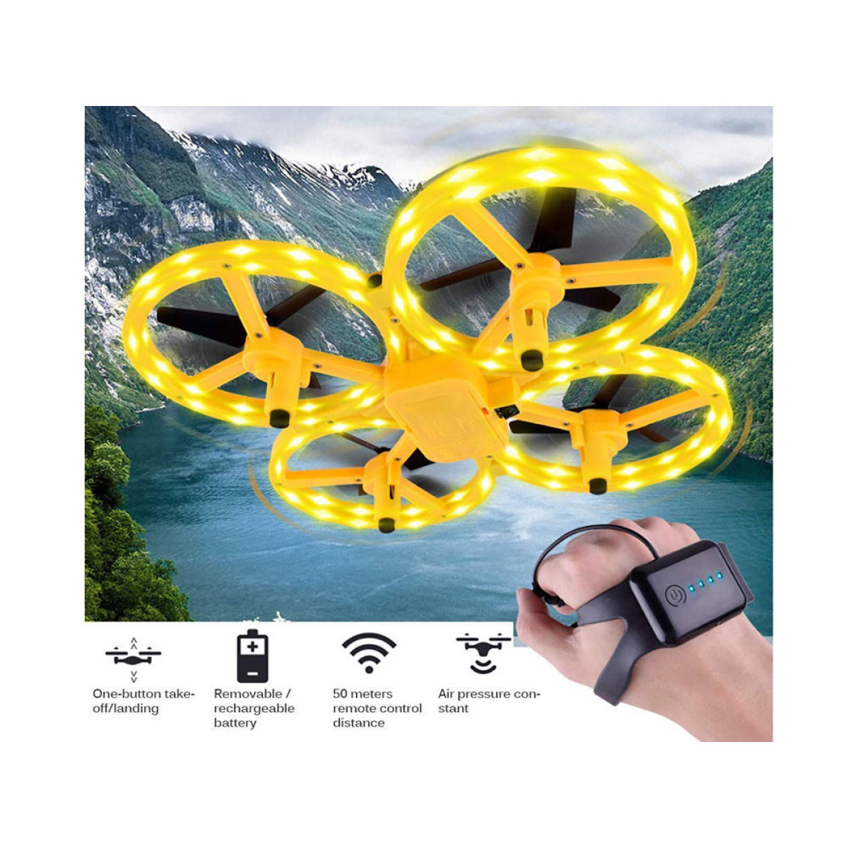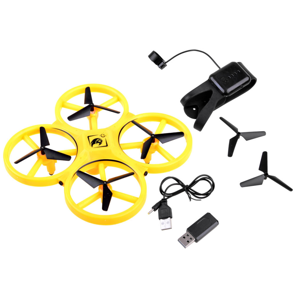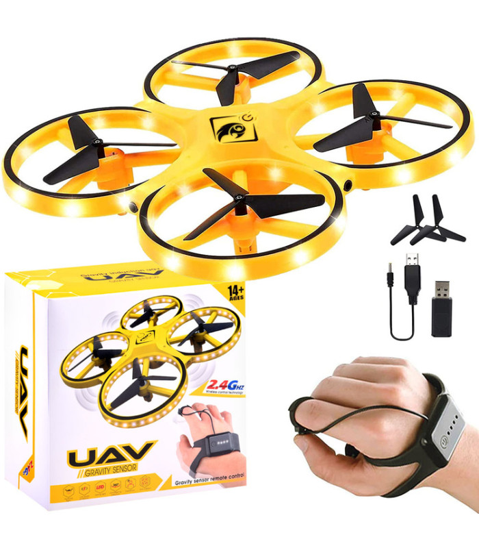 Kvadrokopter UAV Gravitatsioonisensor on suurepärane mänguasi lastele, kes armastavad lendavaid mänguasju. See on valmistatud plastikust ja varustatud LED-valgustusega, mis muudab selle hämaras eriti efektseks. Droon on juhitav spetsiaalse käele kinnitatava pultiga, nagu kell. Käega või žestidega juhitav mänguasi pakub laialdasi manööverdamisvõimalusi. Piisab vaid käe kergest liigutusest, et muuta drooni lennusuunda - paremale, vasakule, üles või alla.