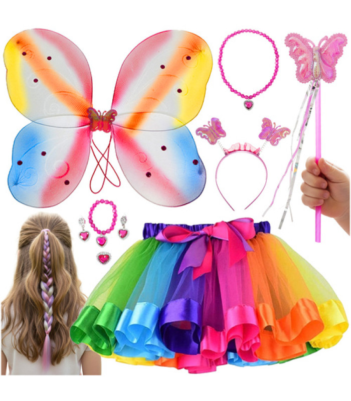 - pilnas komplektas – sparnai, vaivorykštės spalvų sijonas, galvos juosta su antenomis, burtų lazdelė, ombre šukuosena ir papuošalai, nieko nereikia surinkti – tiesiog išimkite iš pakuotės ir apranga paruošta žaisti ar eiti į balių