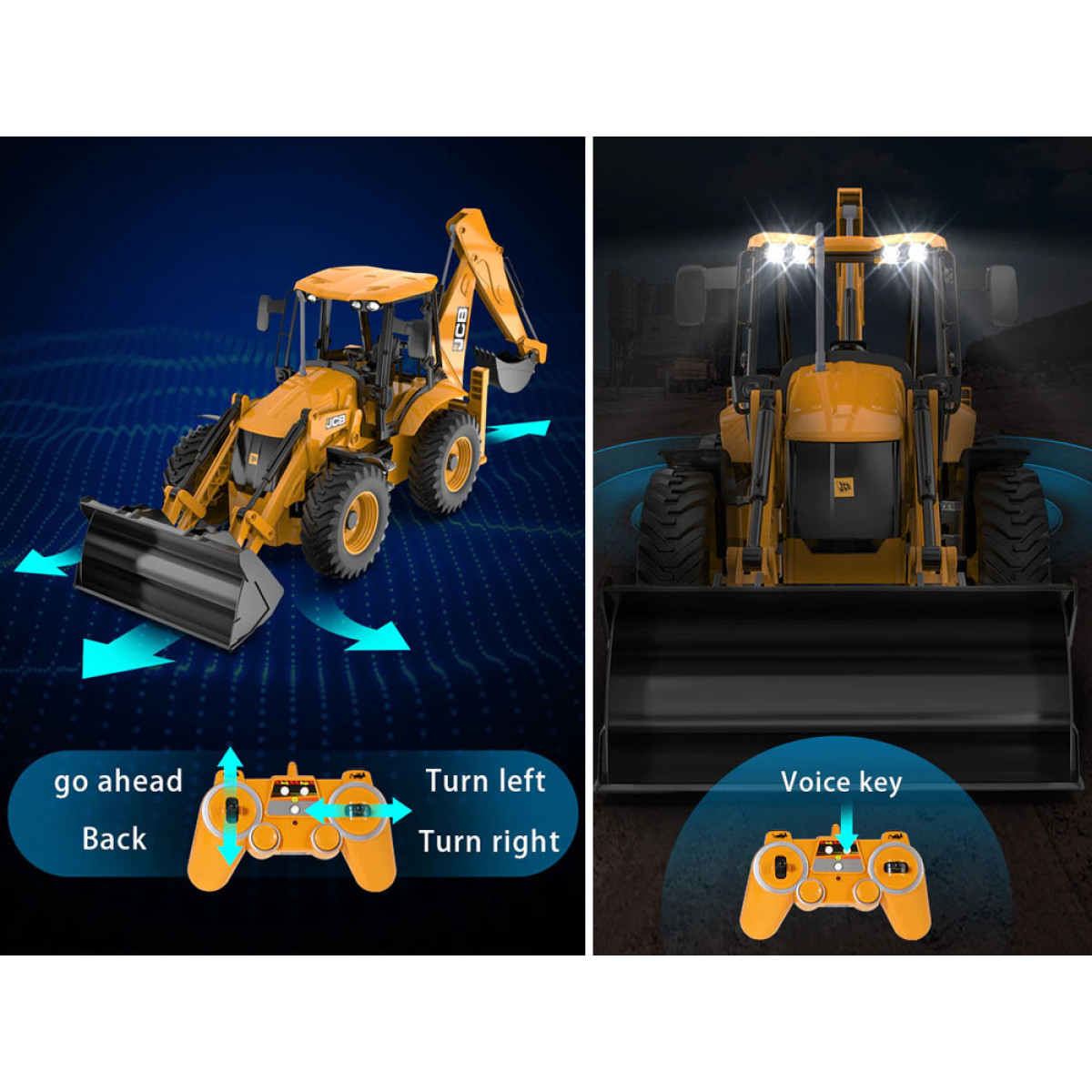 Värske disain: Selle erksad värvid meenutavad tõelisi ehitusmasinaid. Täpne detailide jäljendamine võimaldab masinal tõhusalt töötada igal ehitusplatsil. Masinat juhitakse 2,4 GHz kaugjuhtimispuldiga, mis võimaldab sõita edasi, tagasi, pöörata paremale ja vasakule ning tõsta ja langetada laadurikühvlit.