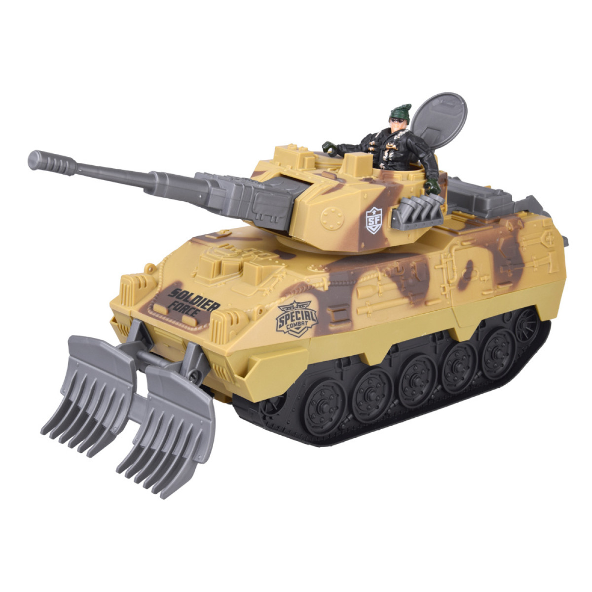 - Tank koos lükandkopa, pöörleva torni, avaneva luugi (koht sõdurifiguurile) ja liikuva toruga - tõeliste manöövrite jaoks.