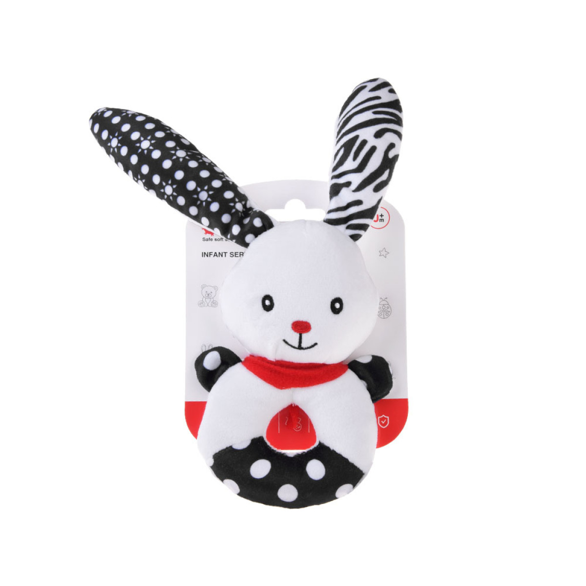 Armas, naeratav kanin on ideaalne valik kõige väiksematele lastele alates esimestest elukuudest. Mänguasi mõõtmetega 14 cm x 10 cm x 5 cm on disainitud beebide vajadusi silmas pidades. Valmistatud kontrastsetes värvides – must ja valge, mida rikastavad erinevad mustrid, nagu rõngad või päikesed. Täiendavaks aktsendiks on punane nina ja punane sall, mis köidavad lapse tähelepanu.