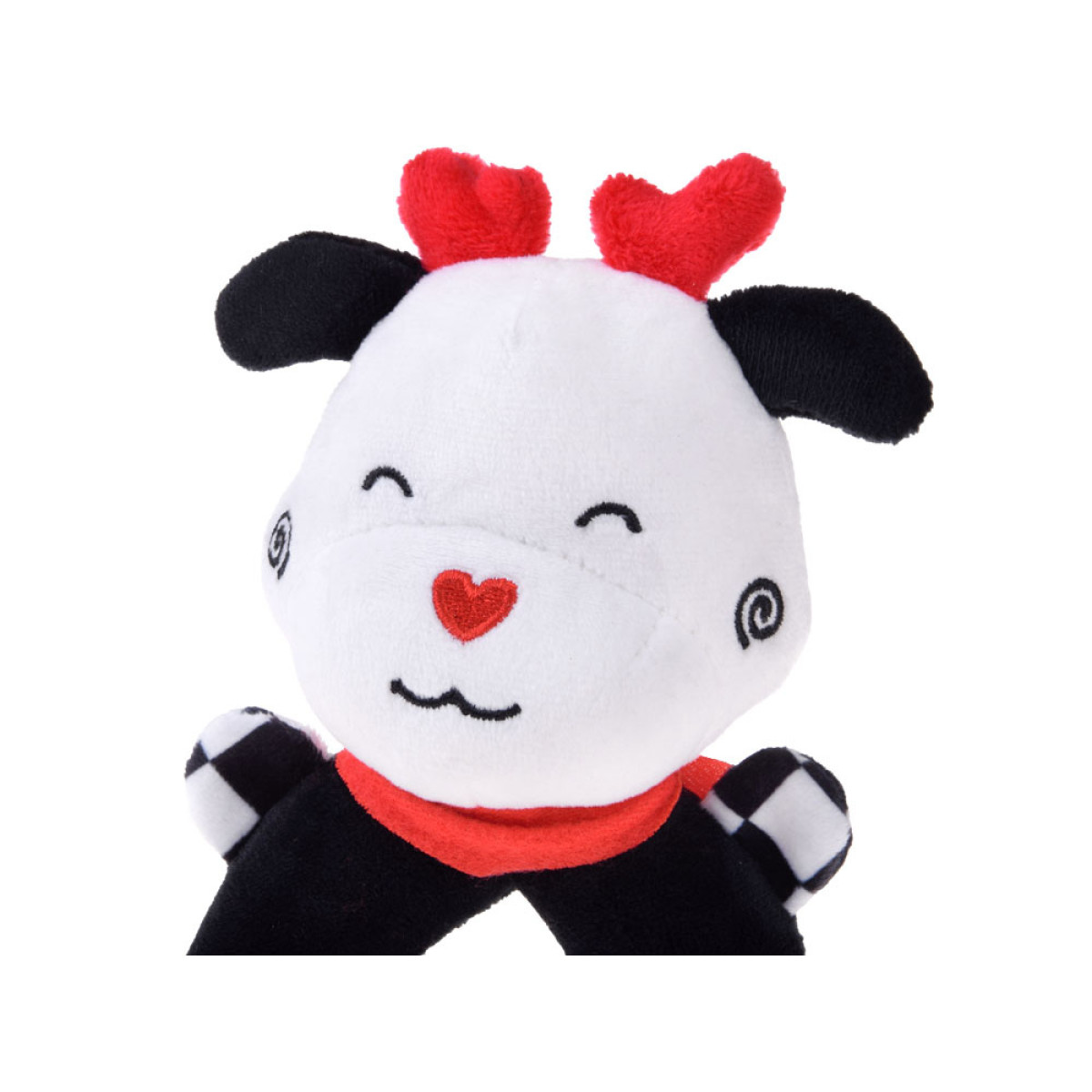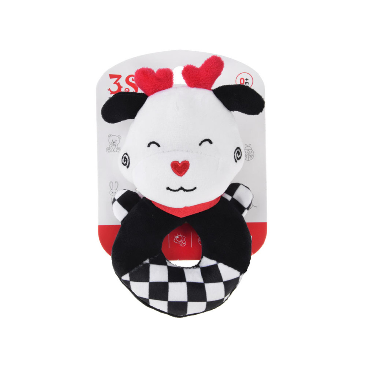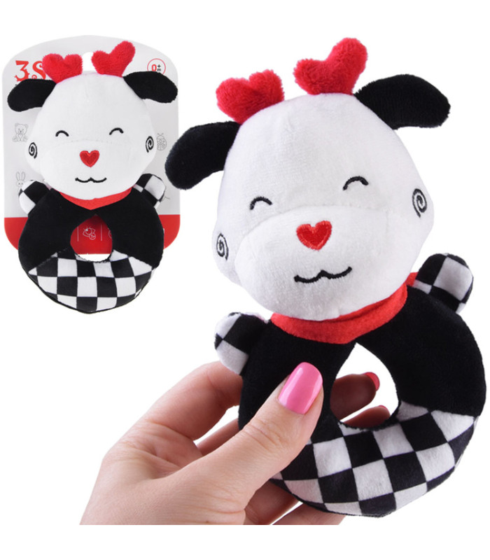 Armas, naeratav lehm on ideaalne valik kõige väiksematele lastele alates esimestest elukuudest. Maskott on mõõtmetega 16 cm x 10 cm x 6 cm ja on disainitud imikute vajadusi arvestades. See on valmistatud kontrastsetes värvides – must ja valge – ruudulise mustriga. Täiendavaks aktsendiks on punane südamekujuline nina, punane sall ja punased sarved, mis köidavad lapse tähelepanu.