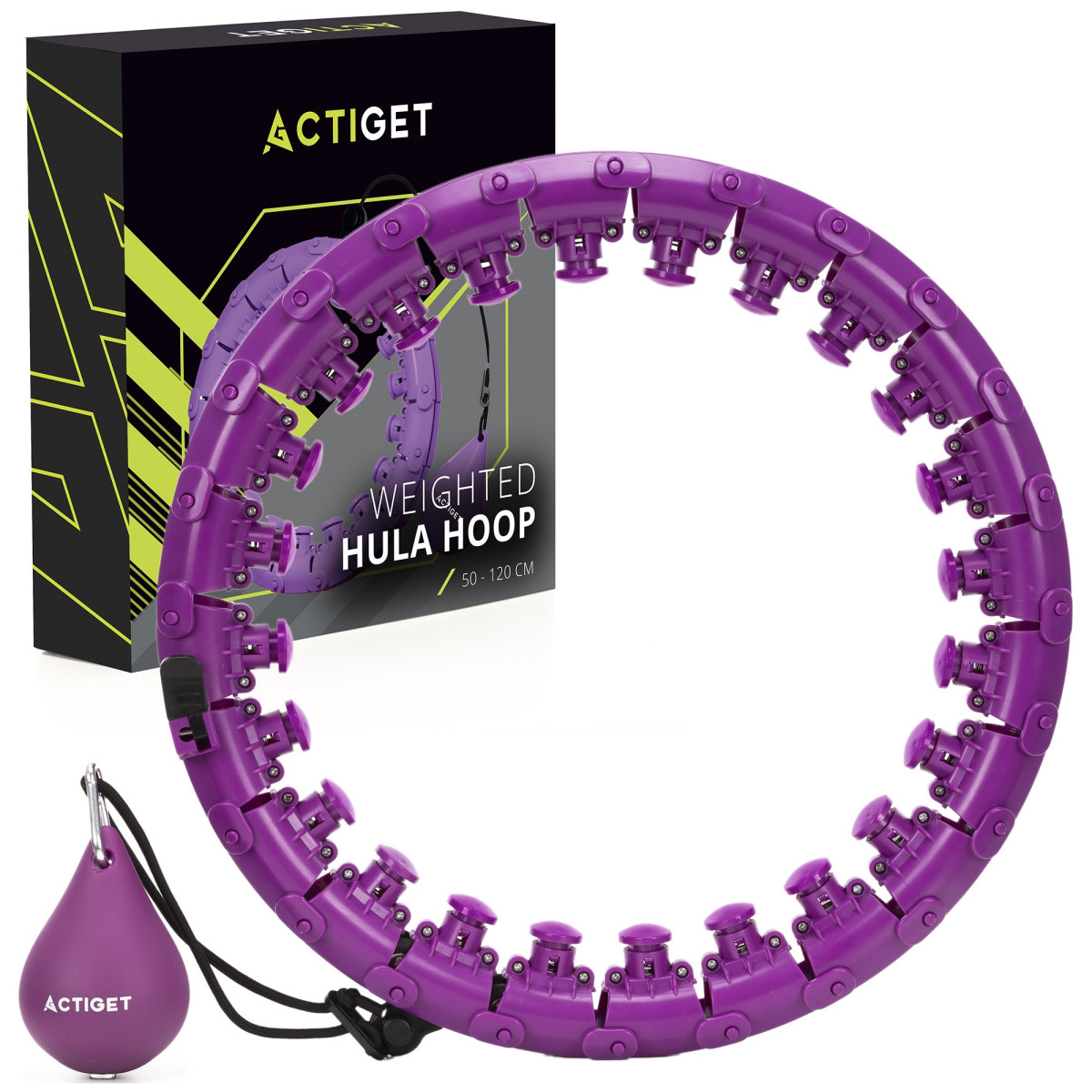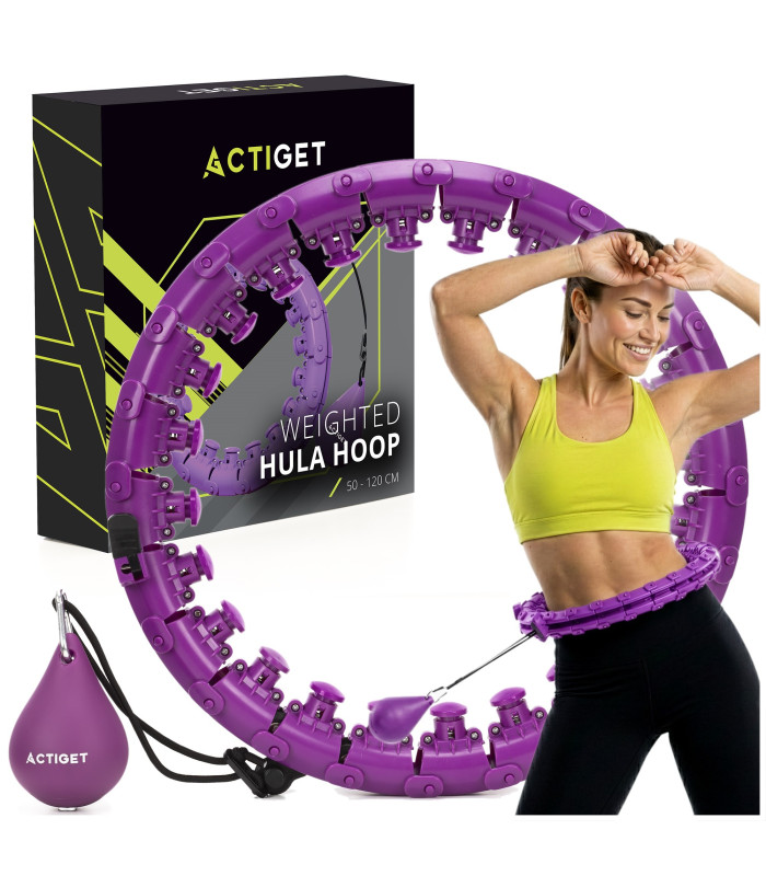 Kaubamärk: Actiget® Seeria: universaalne seeria Hula Hoop materjal: ABS Raskuste materjal: PP, liiv Värv: lilla Osade arv: 24 Massaažielementide arv: 24 Reguleeritav ümbermõõt vastavalt kehakujule Reguleeritav raskusnööri pikkus Ise kokkupandav toode Reguleeritav kaal — võimalik lisada või eemaldada raskusi Ühe raskuse kaal: 280 g Kokkupandav Hula Hoop rõngas Kuullaagrid Kaal: 0,9 kg Mõõtmed: Sisemine läbimõõt kõigi osadega: 30 cm Välimine läbimõõt kõigi osadega: 41 cm Reguleeritav ümbermõõt: 50 – 120 cm (min. – maks.) Raskuse hoidja pikkuse reguleerimine: 22 – 37 cm Toru läbimõõt: 4 cm Raskuse mõõdud: 11 x 6 cm (kõrgus x läbimõõt) Lisainfo: Tootel on Actiget® logo