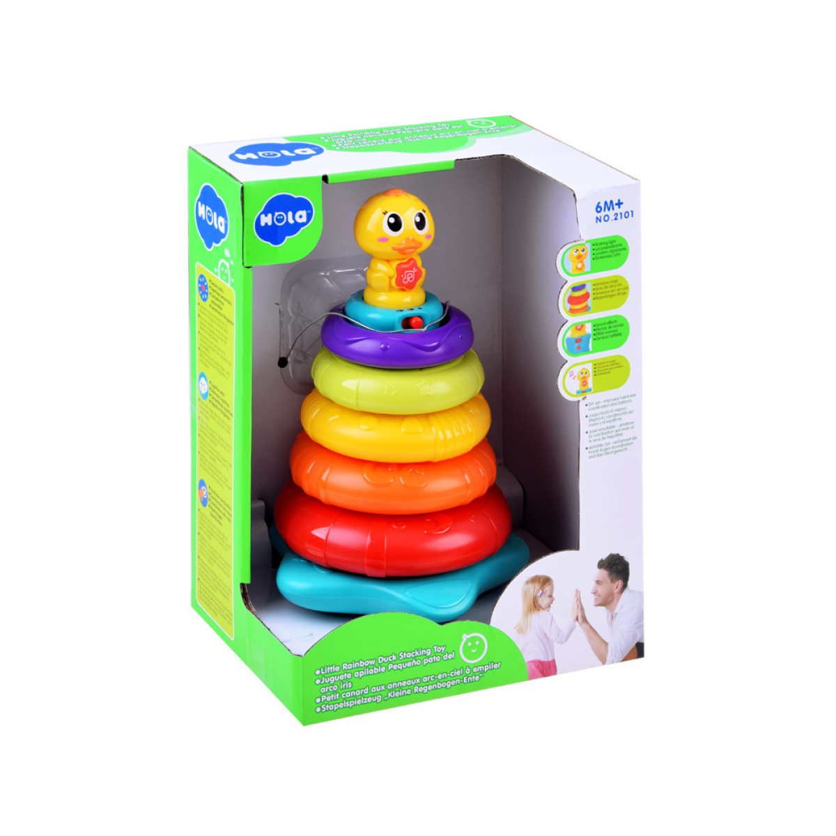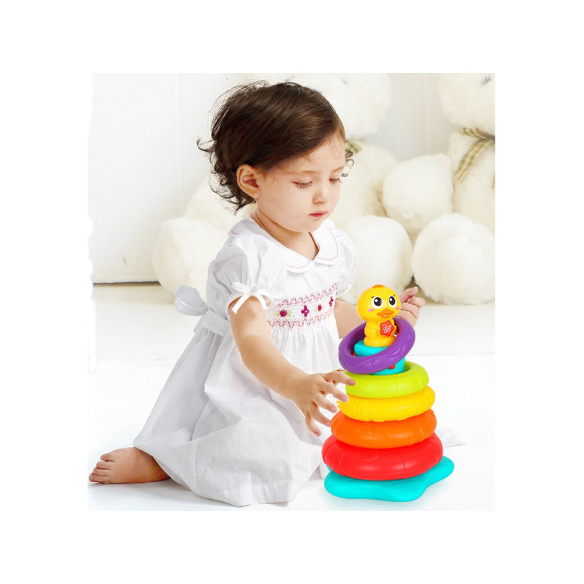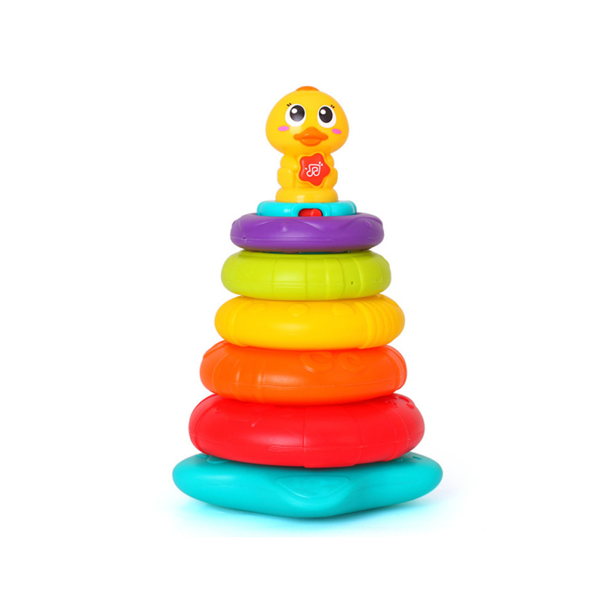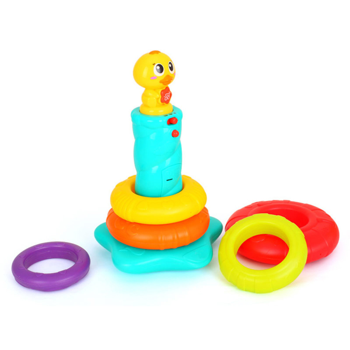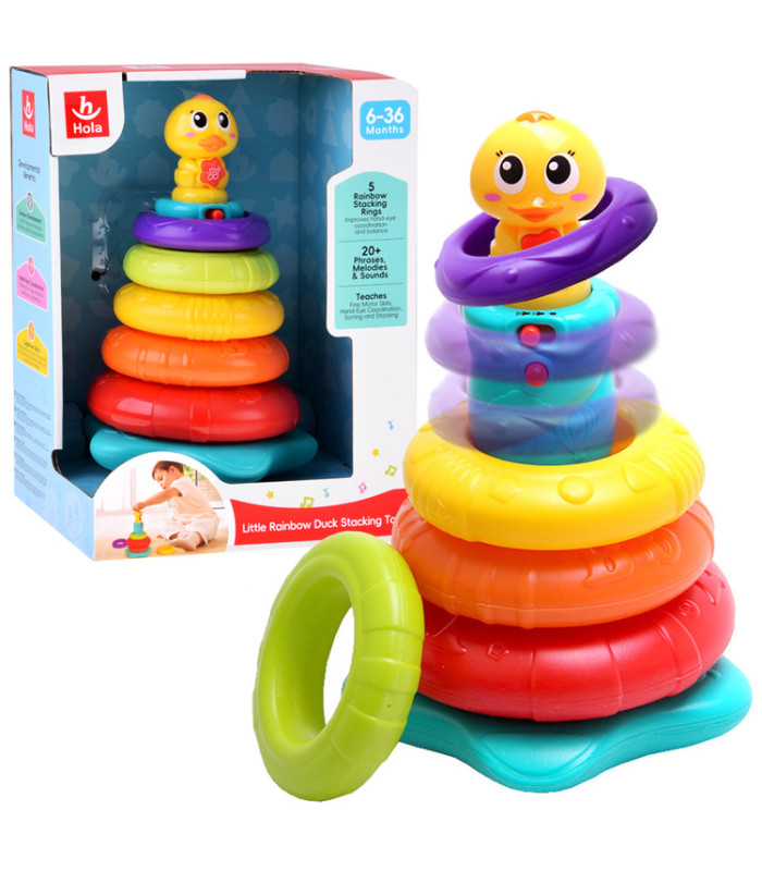 Värviline ja hariv püramiid väikelastele. Mänguasja juurde kuulub viis värvilist rõngast, mida saab asetada interaktiivsele vardale, mille tipus on pardikese pea.