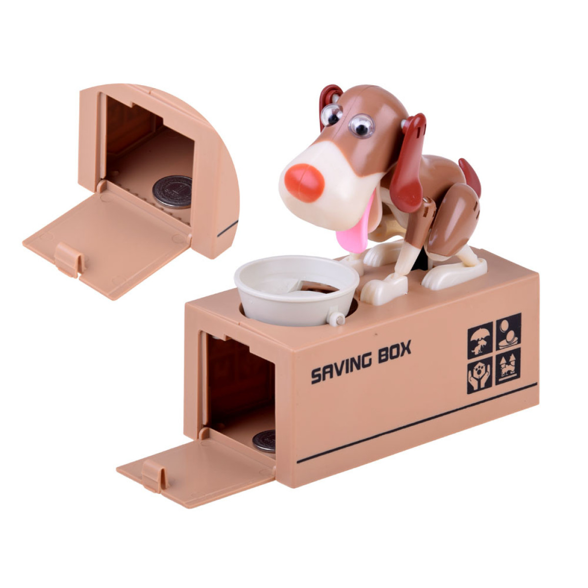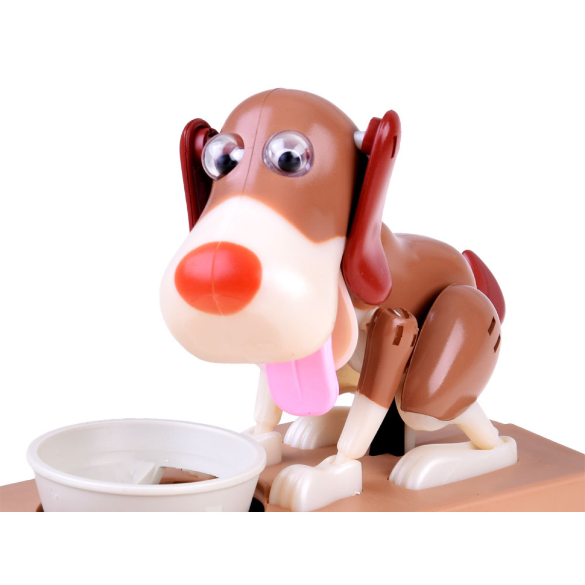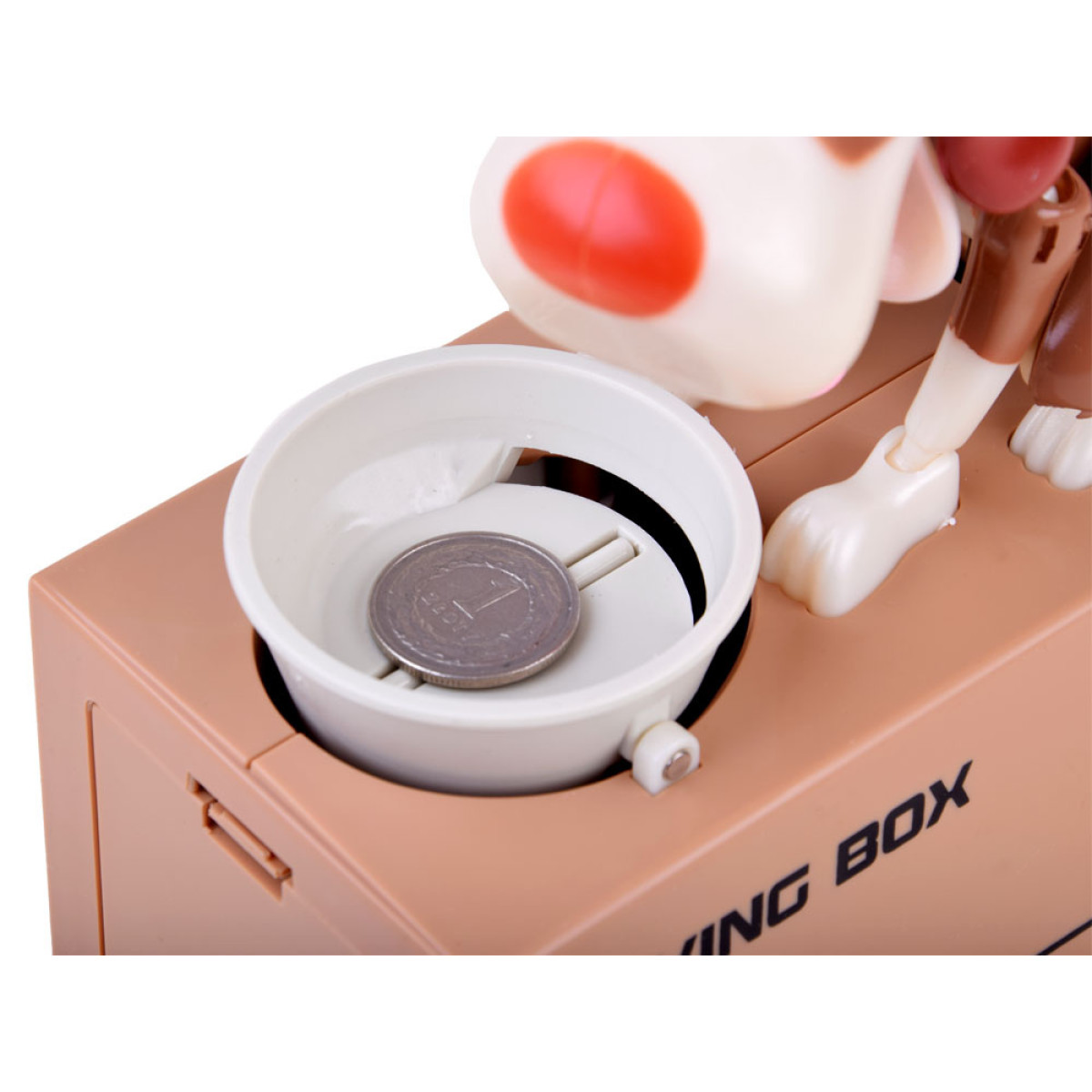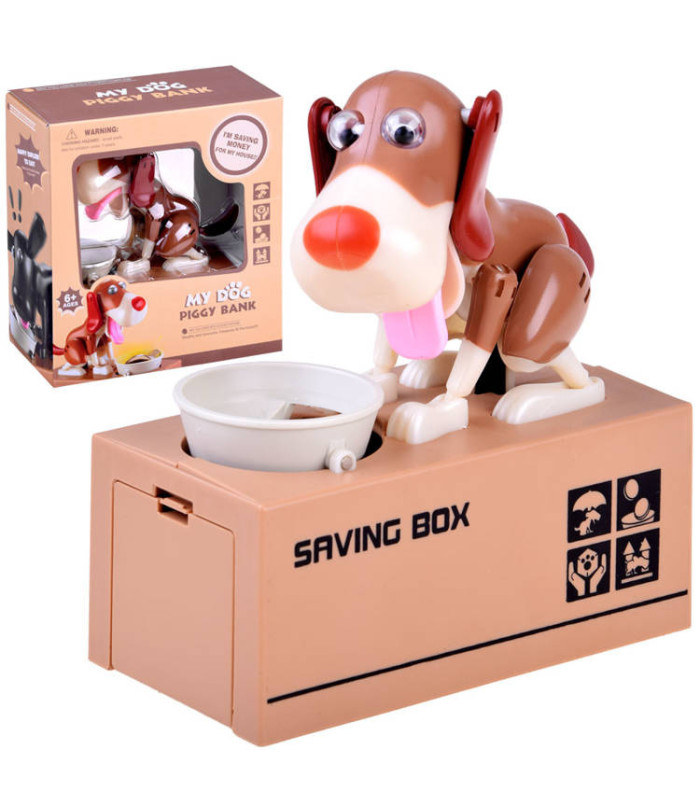 Pange münt koera kausile, mis asub tema ees. Selle puudutuse mõjul hakkab koer liikuma, justkui sööks ta toitu kausist, mille tulemuseks on mündi kukkumine rahakassasse. Koer liigub lõbusalt ja kõigutab kõrvu, kui ta "sööb" raha. Rahakassa tööks on vaja 3 patareid. See õpetab lapsi raha säästma ja pakub palju meelelahutust, aidates mõista, et säästmine on täiesti lahe ja toob kaasa ainult positiivseid tulemusi. Mündid saab hõlpsasti eemaldada avast, mis on kaetud korgiga.