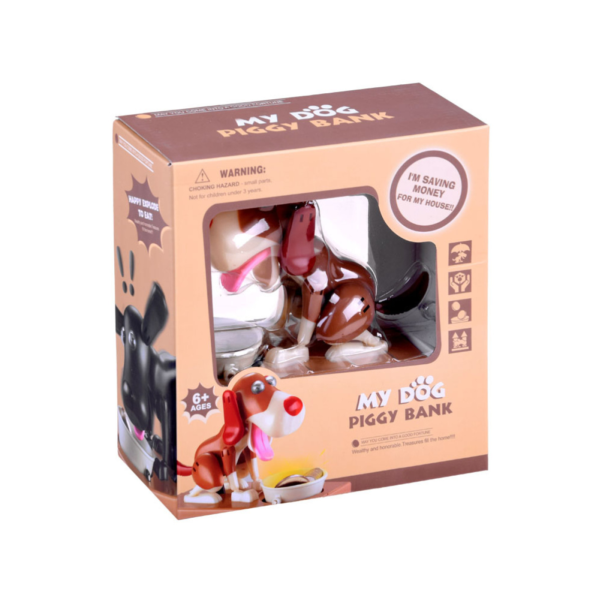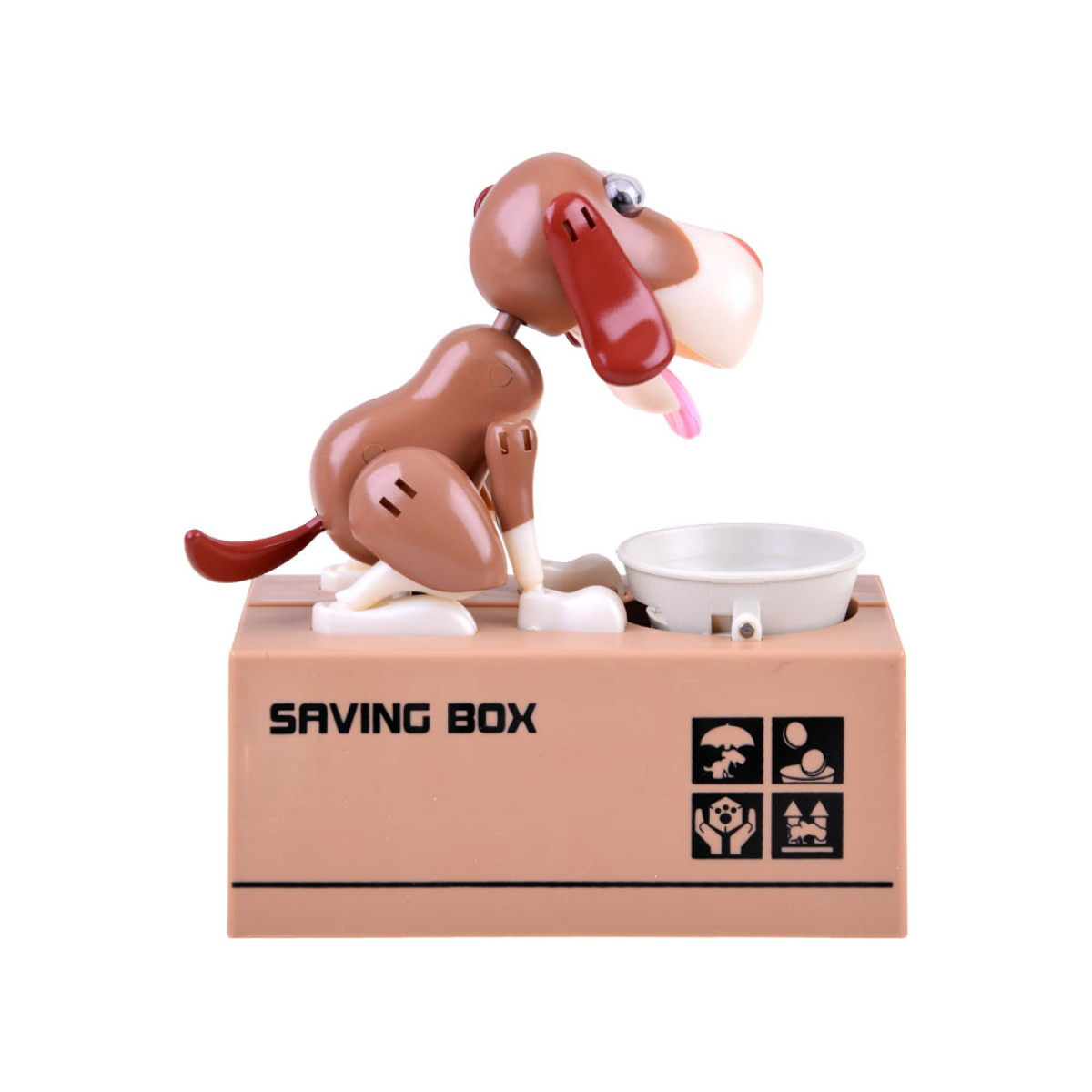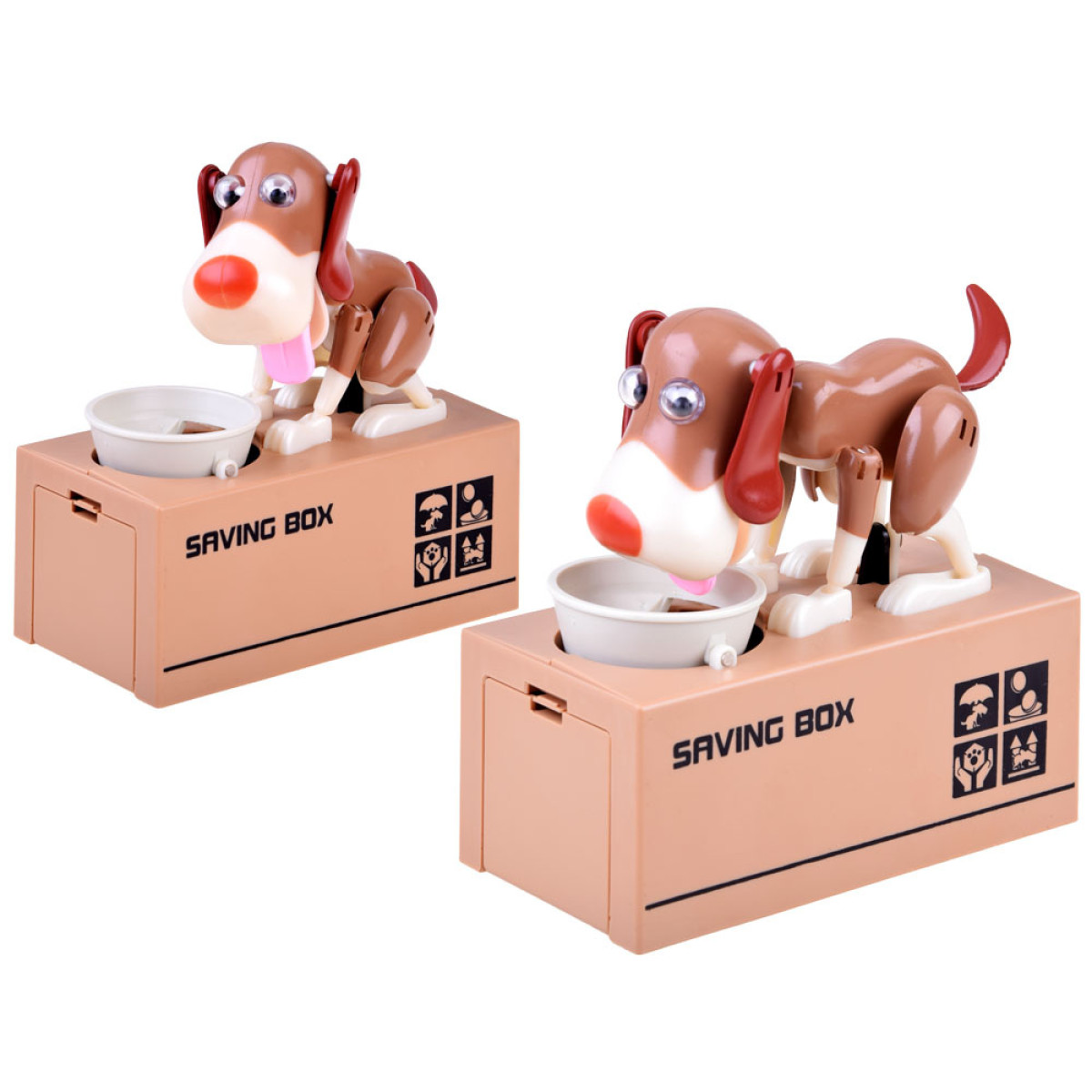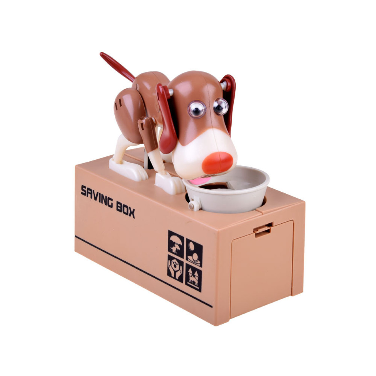 Pange münt koera kausile, mis asub tema ees. Selle puudutuse mõjul hakkab koer liikuma, justkui sööks ta toitu kausist, mille tulemuseks on mündi kukkumine rahakassasse. Koer liigub lõbusalt ja kõigutab kõrvu, kui ta "sööb" raha. Rahakassa tööks on vaja 3 patareid. See õpetab lapsi raha säästma ja pakub palju meelelahutust, aidates mõista, et säästmine on täiesti lahe ja toob kaasa ainult positiivseid tulemusi. Mündid saab hõlpsasti eemaldada avast, mis on kaetud korgiga.