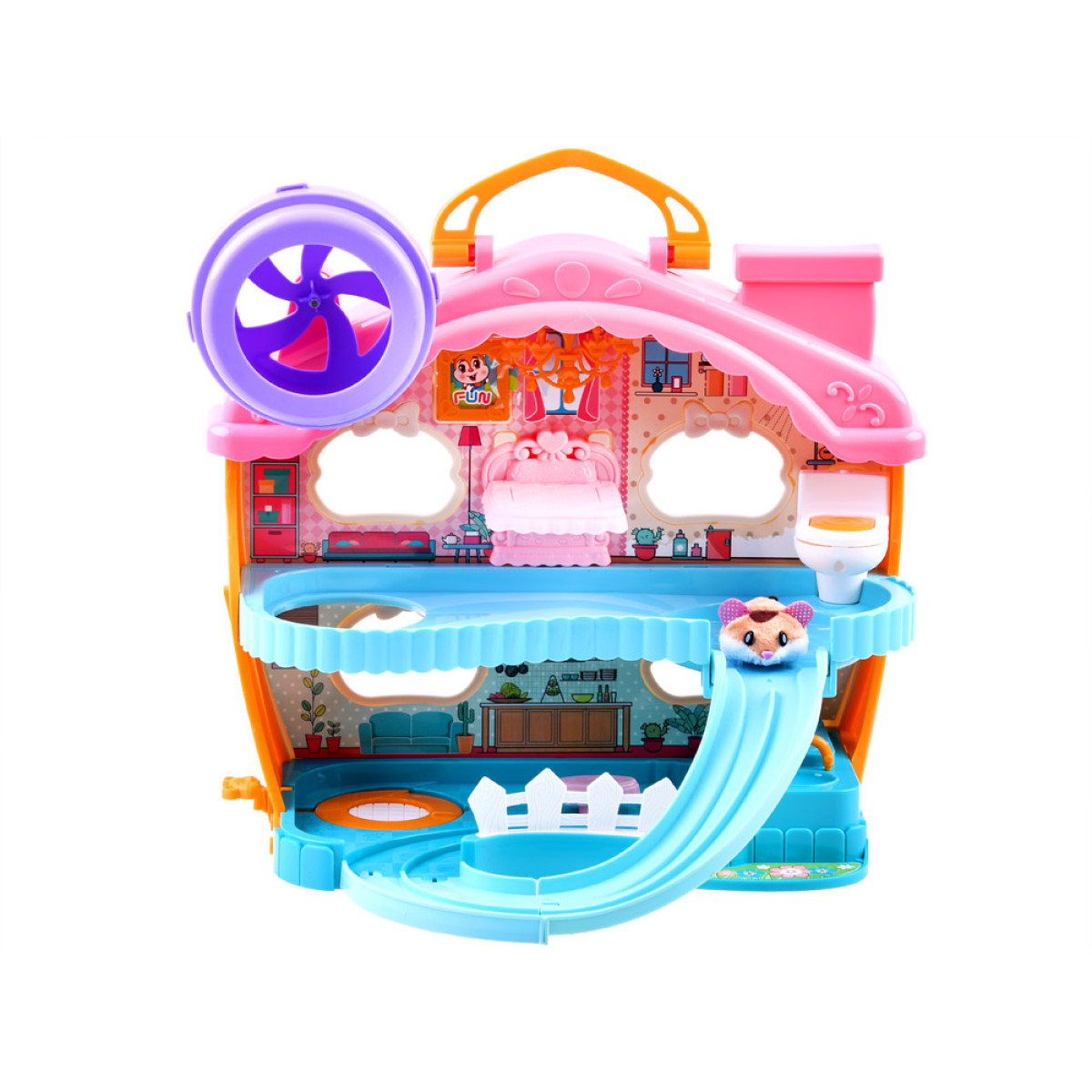 Kodu on varustatud käepidemega, mis lihtsustab transportimist. Kodu töötab 3 x AAA patareidega (ei kuulu komplekti). Hamster töötab AG13 patareiga (kuulub komplekti) ja on kohe mängimiseks valmis.