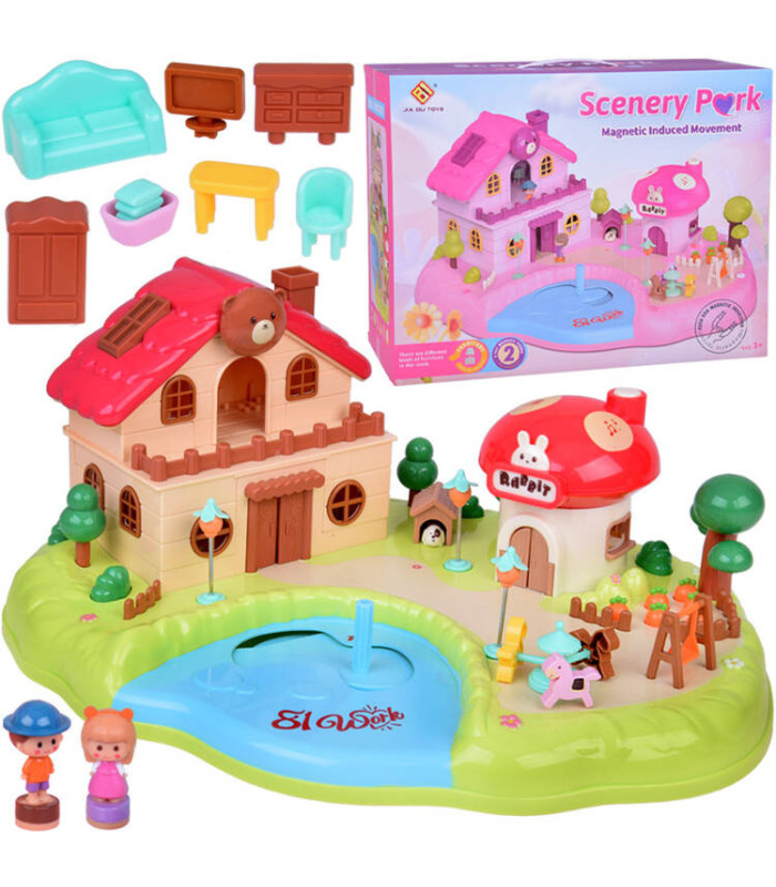 Magnetiline Mängumaja Liikuvate Elementidega - "Scenery Park" on hariv mänguasi, mis põhineb magnetilise induktsiooni tekitatud liikumisel. Komplekt sisaldab värvikat maastikku koos võluva, avatava majaga, seenekujulise poega ning mänguväljakuga, mida ümbritsevad puud, porgandipeenar ja muud armsad detailid. Mänguasi on varustatud helide ja valguse efektidega, mis kindlasti lisavad mängule põnevust.