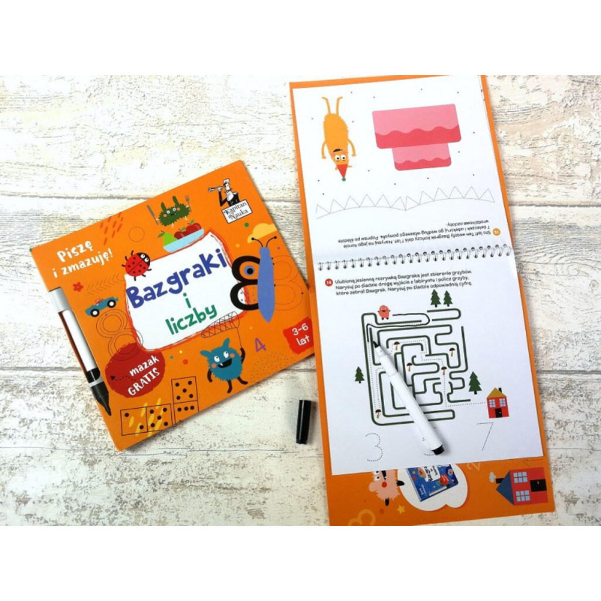 Bazgraki ja numbrid. Kirjuta ja kustuta! (3–6 aastat) on graafiline raamat, mis valmistab lapsi ette arvutamiseks kuni 10. Koos sõbralike Bazgrakidega lahendavad lapsed erinevaid ja kaasahaaravaid graafilisi ülesandeid, nagu numbrite jälgimine, numbrite otsimine esemetest, domino mängimine ning kellaaegade lugemise proovimine. Nii tutvuvad nad järk-järgult arvudega ja avastavad, et igaüks neist tähistab kindlat elementide kogumit. Ülesandeid lahendades valmistub laps varajaste kooliväljakutsete jaoks, õpib eristama kirjutatud numbreid, mõistma koguse mõistet ja võrdlema kogumite suurust.