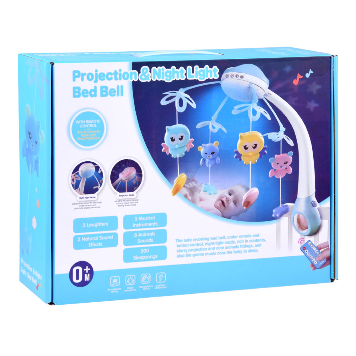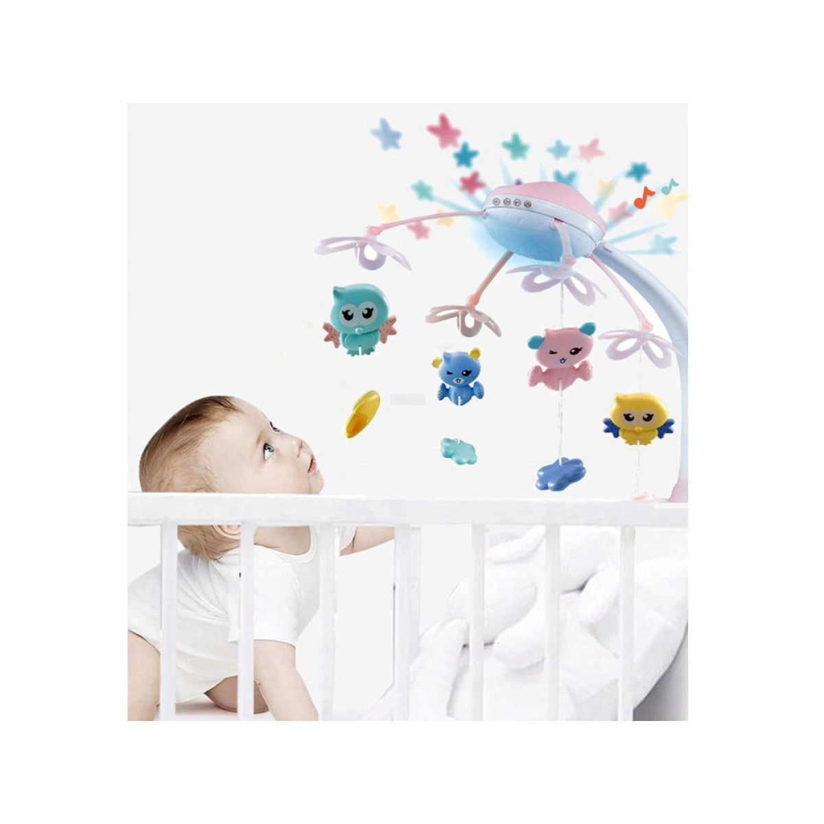 Karussell koos projektori ja heliga, mida juhitakse kaugjuhtimispuldiga, rõõmustab iga ema ja isa ning pakub beebile visuaalsete ja heliliste elamuste hetki. Karussell võib saata lapsi une ja ärkveloleku ajal juba esimestest elupäevadest alates. Tänu kaasasolevale muusikakastile ja projektorile loob see fantastilise heli- ja visuaalshow. Karussell koos muusikakasti ja mänguasjadega – interaktiivne mänguasi laste tuppa. Armsad plastikust loomafiguurid sobivad igasse beebivoodisse. See on suurepärane viis äratada beebi huvi, kes vahel voodis olles igavleb. Muusikakastisse salvestatud öömeloodiad on väga rahustavad ja ideaalsed unelaule. Projektor kuvab seintele ja lakke õrnu tähti. Karusselli konstruktsioon on plastikust ning mänguasjad on pastelltoonides. Karussell rahustab lapsi ja aitab neil uinuda, toetades samal ajal lapse arengut. Uinumine võib olla raske, eriti uudishimuliku lapse jaoks, kuid kui pea kohal keerlevad armsad loomakesed ja taustal kõlab unelaul, muutub uinumine tõeliseks naudinguks.