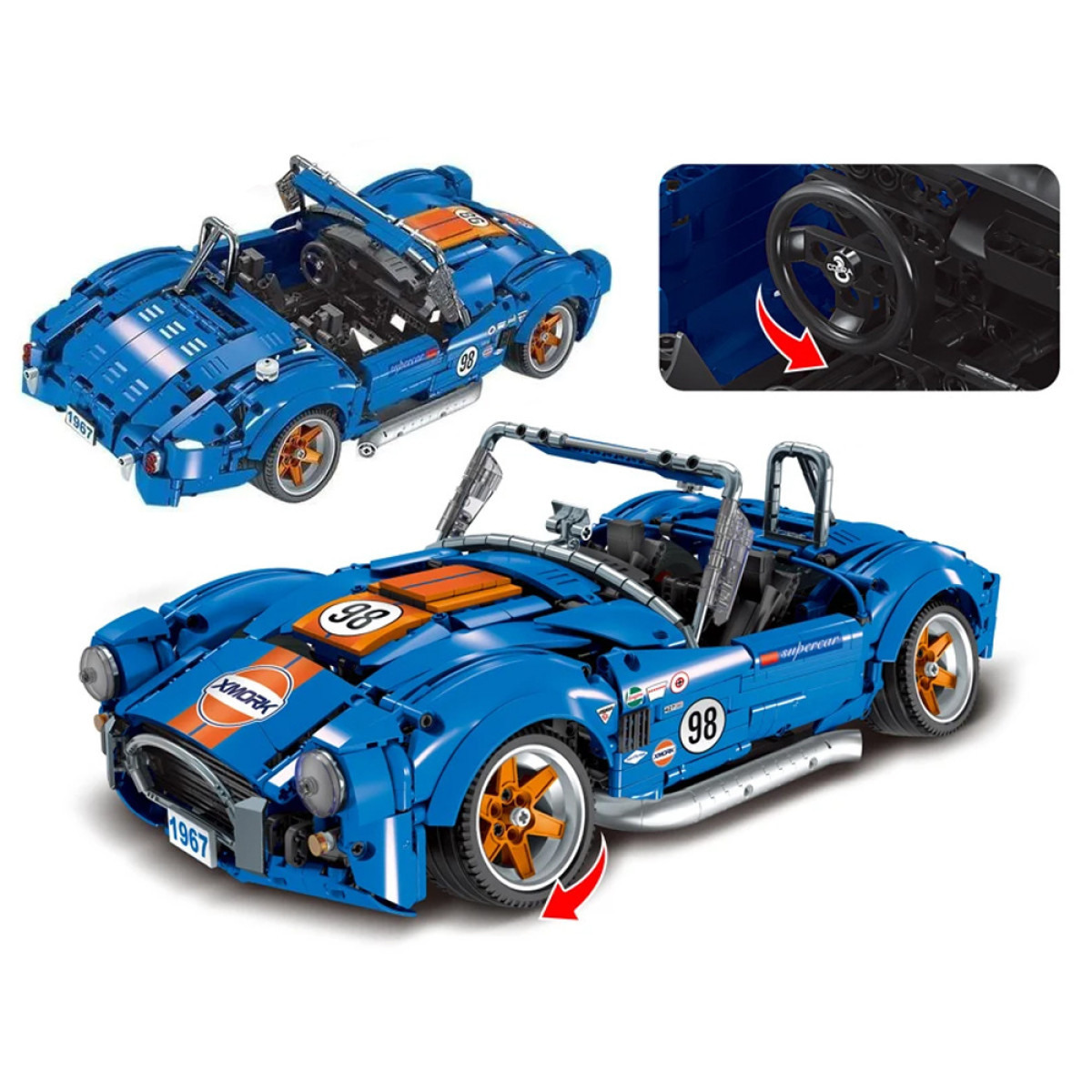 Mitmekomponentne komplekt võimaldab ehitada autot avatavate uste, kapoti ja pagasiruumiga. Ustele on lisatud mehhanism, mis võimaldab neid avada ja sulgeda nagu päris autos. Auto on varustatud stiilsete velgedega ja mustade kummirehvidega. Auto on ikoonilise sinise värviga ja oranžide detailidega, läbipaistvad esituled täiendavad auto välimust. See komplekt pakub palju tunde lõbu kõigile autotööstuse ja driftimise fännidele.