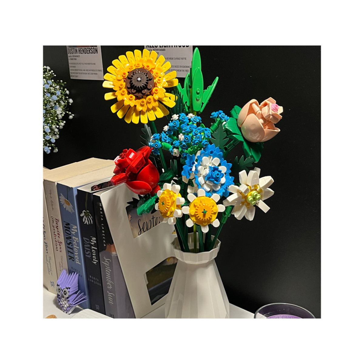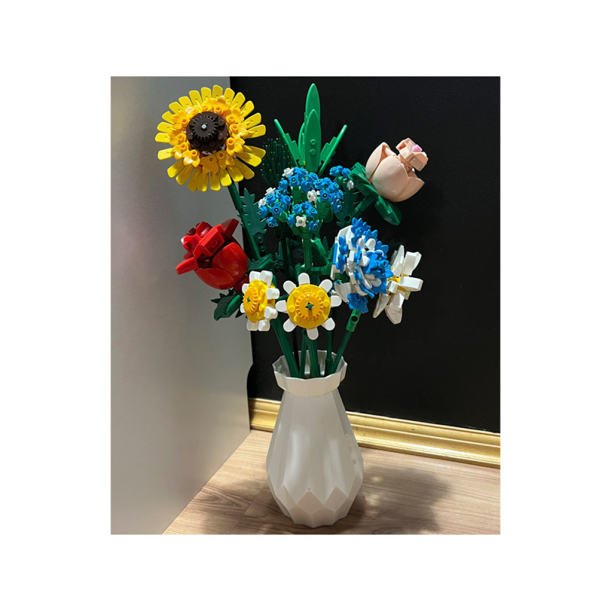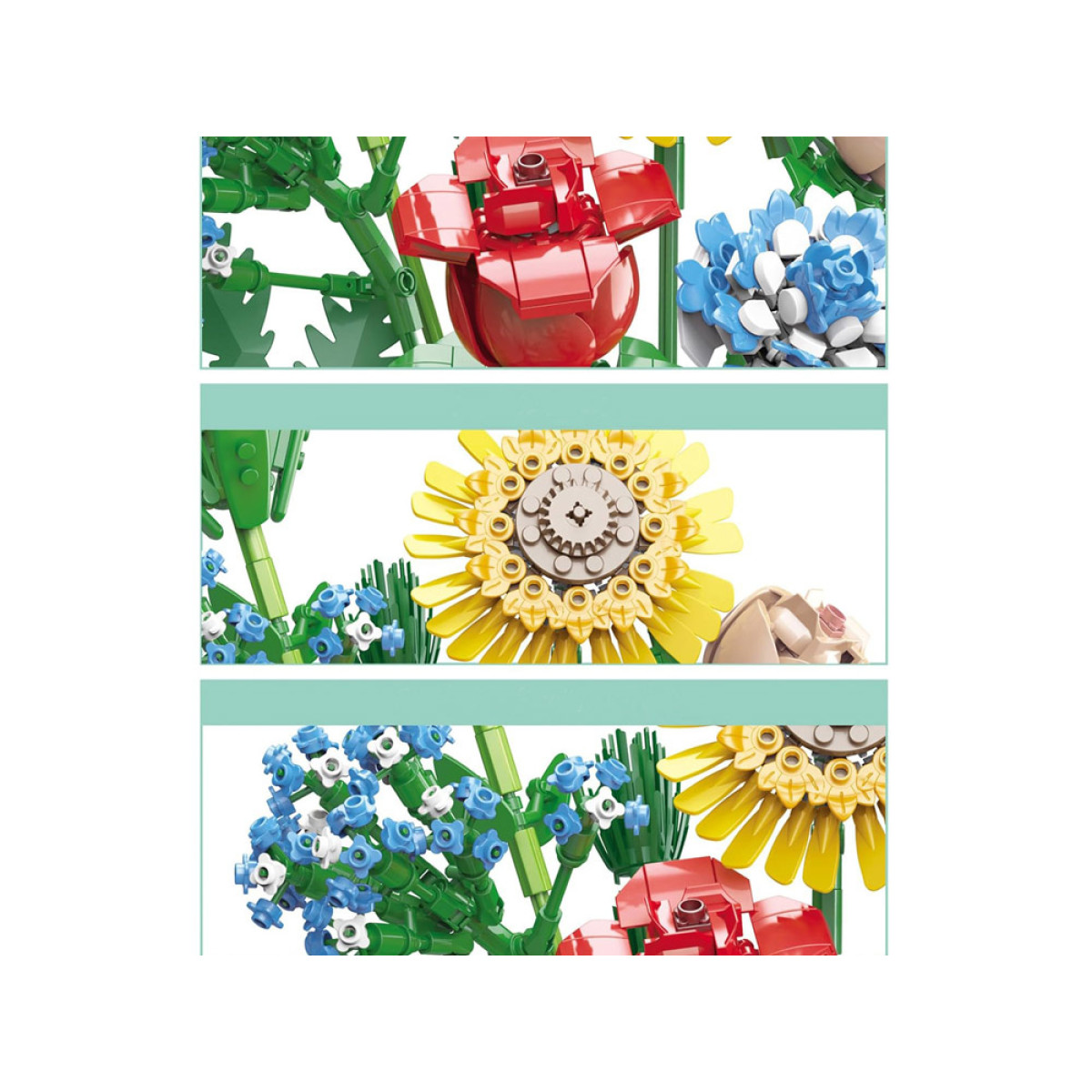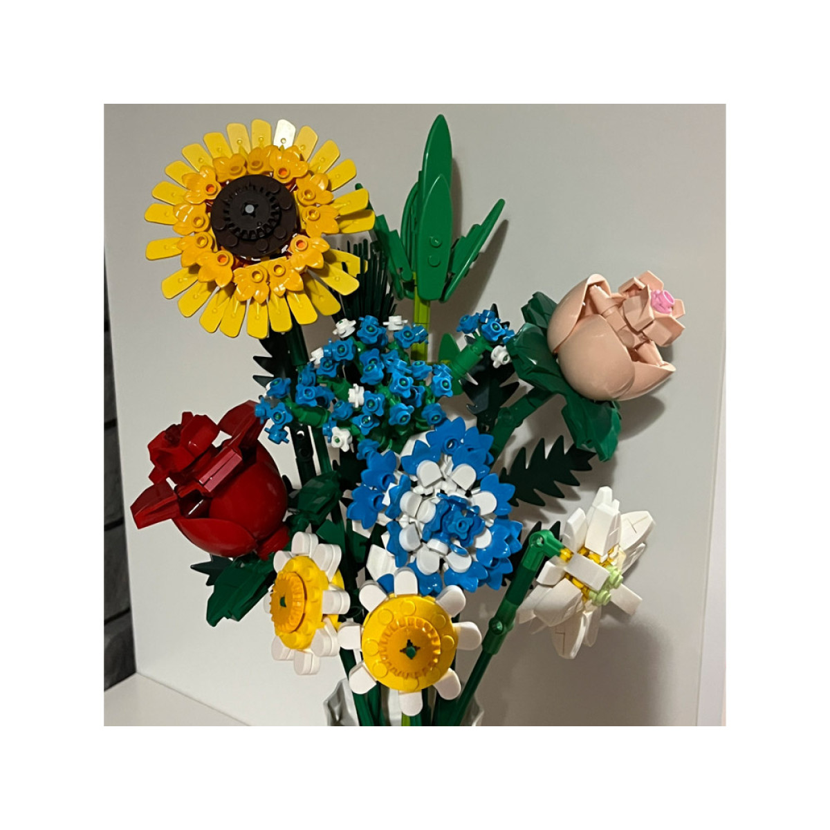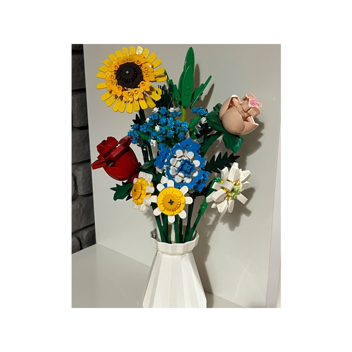 Konstruktoriosad on eri suuruste ja kujuga, mis rikastab kimbu esteetikat. Mõned osad võimaldavad lehti ja kroonlehti pärast kokkupanekut vabalt paigutada, kuna neil on liikumisvõimalus. See valik võimaldab meil kimbu vabalt koostada, mis muudab mängu huvitavamaks.