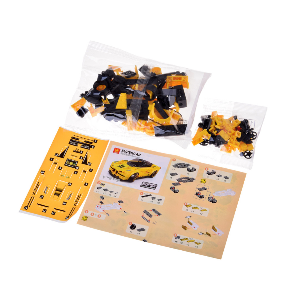 Komplekt koosneb 143 hoolikalt valmistatud osast, mis ühenduvad kergesti stabiilseks konstruktsiooniks. Lisaks sisaldab komplekt kleebiseid, millega noor ehitaja saab autole anda individuaalse ja sportliku ilme.