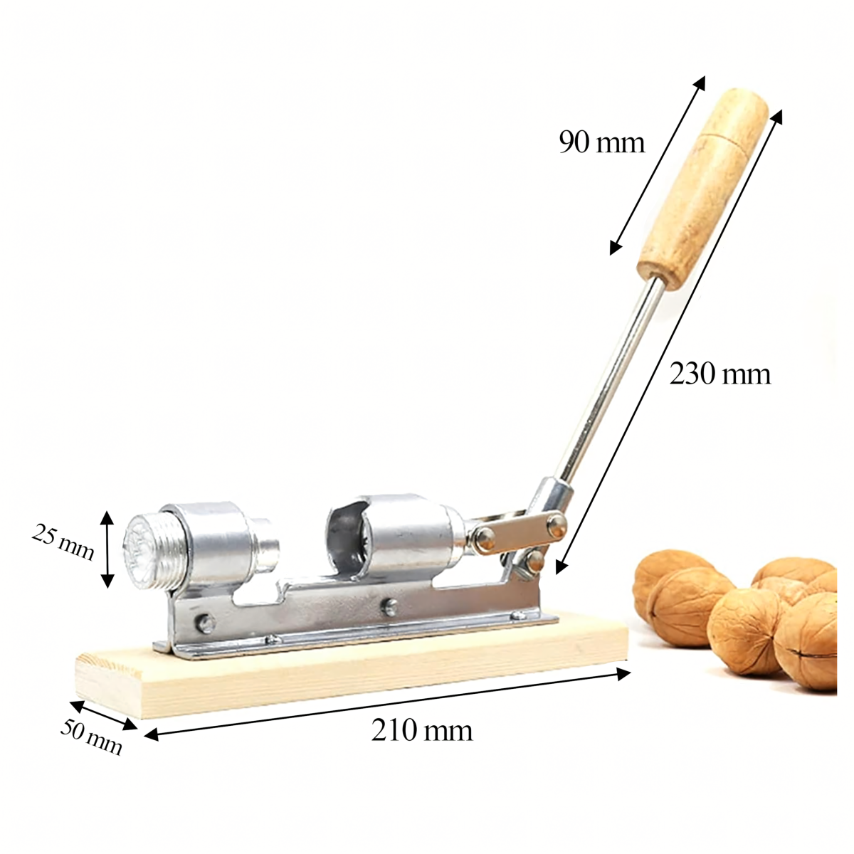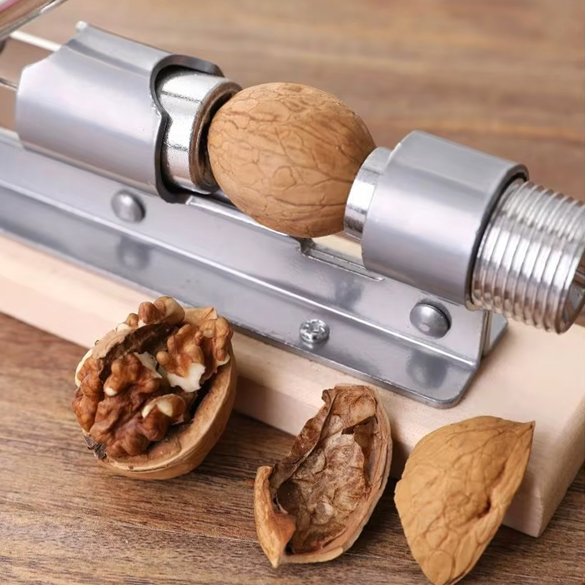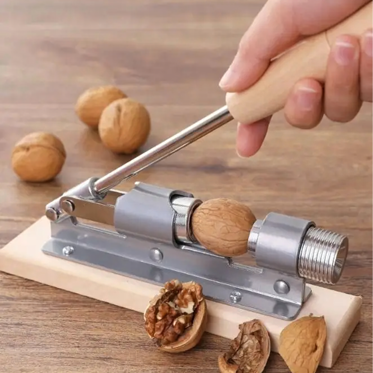 Tugev ja vastupidav pähklipurustaja on valmistatud kvaliteetsest terasest ja paigaldatud puidust alusele. Sobib ideaalselt erinevate pähklite purustamiseks, pakkudes kasutusmugavust ja efektiivsust.