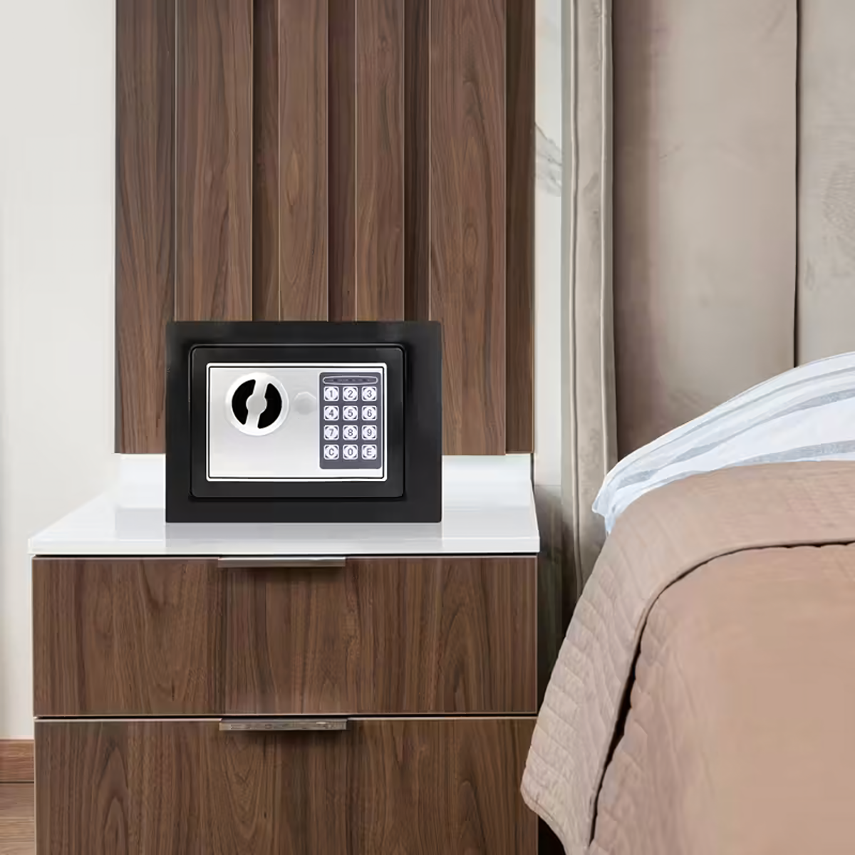 Elektrooniline seif, mis pakub turvalist kaitset sinu väärtuslikele esemetele, on ideaalne kodu- ja kontorikasutuseks. Seif on valmistatud paksust pulbervärvitud terasest, mis tagab vastupidavuse ja turvalisuse aastateks. Seifil on programmeeritav digitaalne kood (3–8 numbrit) ja varuvõti, mis annavad sulle täieliku kontrolli juurdepääsu üle. Sobib suurepäraselt kodu, kontori, hotelli või poe jaoks, kus on oluline dokumentide, ehete, raha või andmekandjate kaitse.